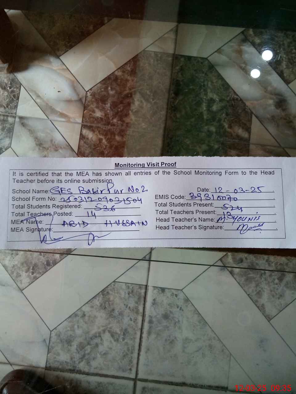 | Attendance Register | Head Teacher | MEA with School | Visit Proof |