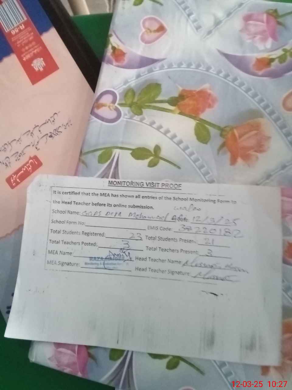 | Attendance Register | Head Teacher | MEA with School | Visit Proof |