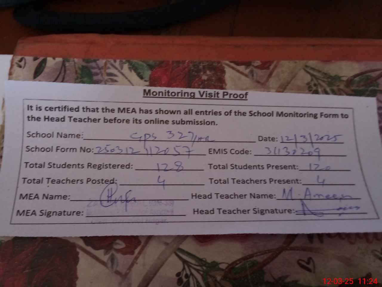 | Attendance Register | Head Teacher | MEA with School | Visit Proof |