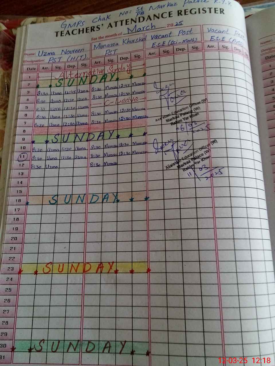 | Name: Uz**** Na**** Designation: (School Headmaster's/Headmistress's) PST Phone/Cell Number: 03**** |