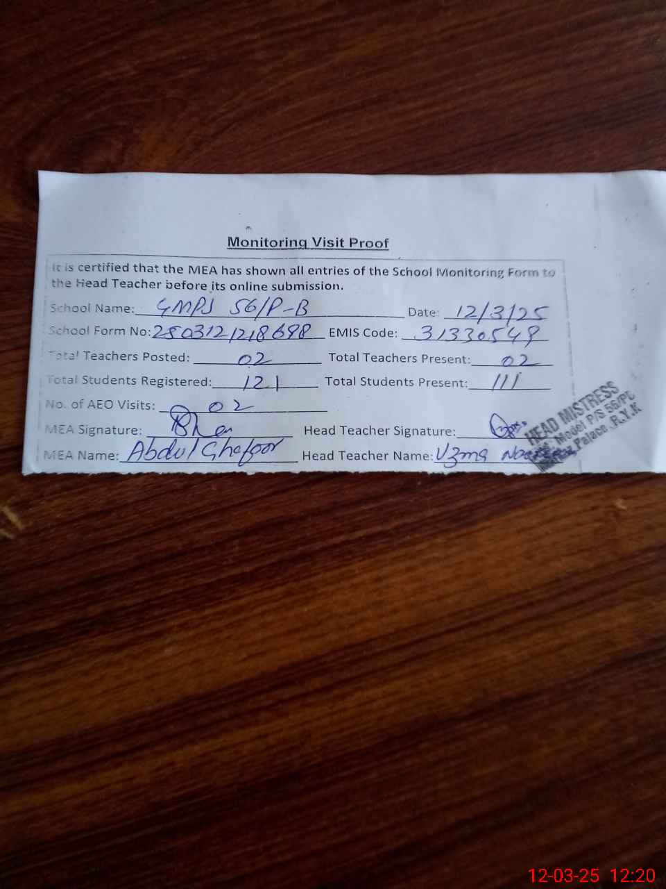 | Attendance Register | Head Teacher | MEA with School | Visit Proof |