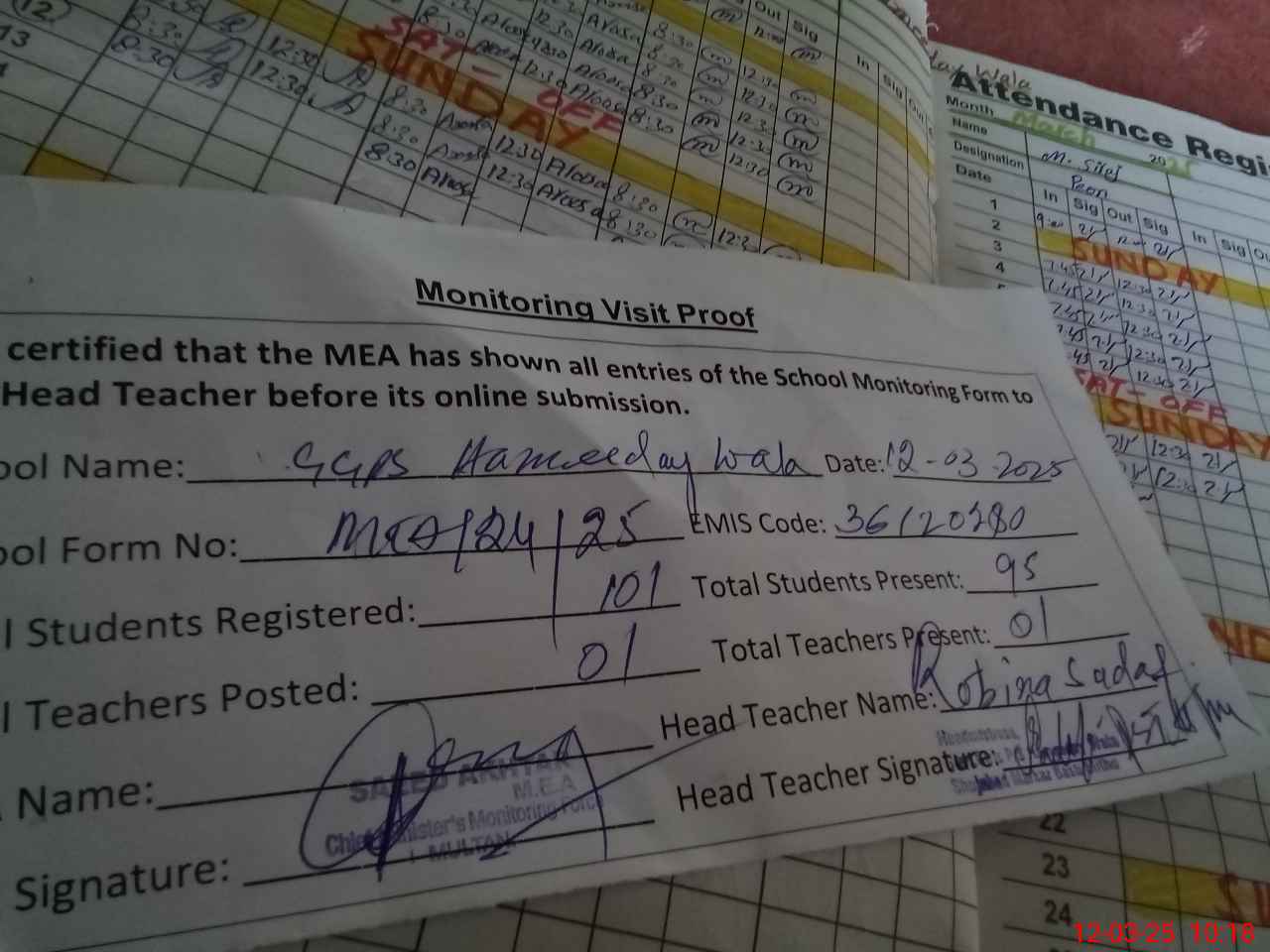 | Attendance Register | Head Teacher | MEA with School | Visit Proof |