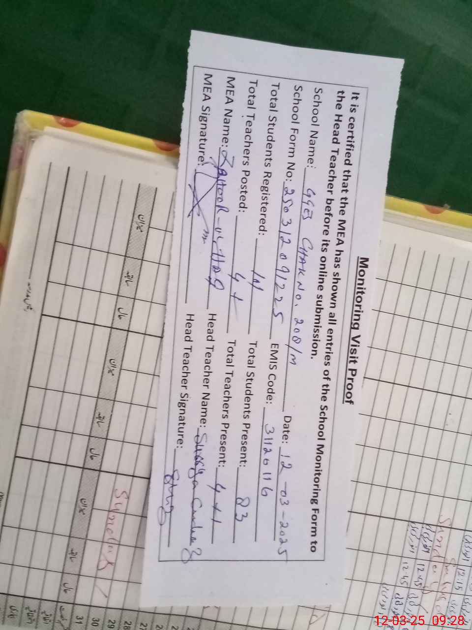 | Attendance Register | Head Teacher | MEA with School | Visit Proof |