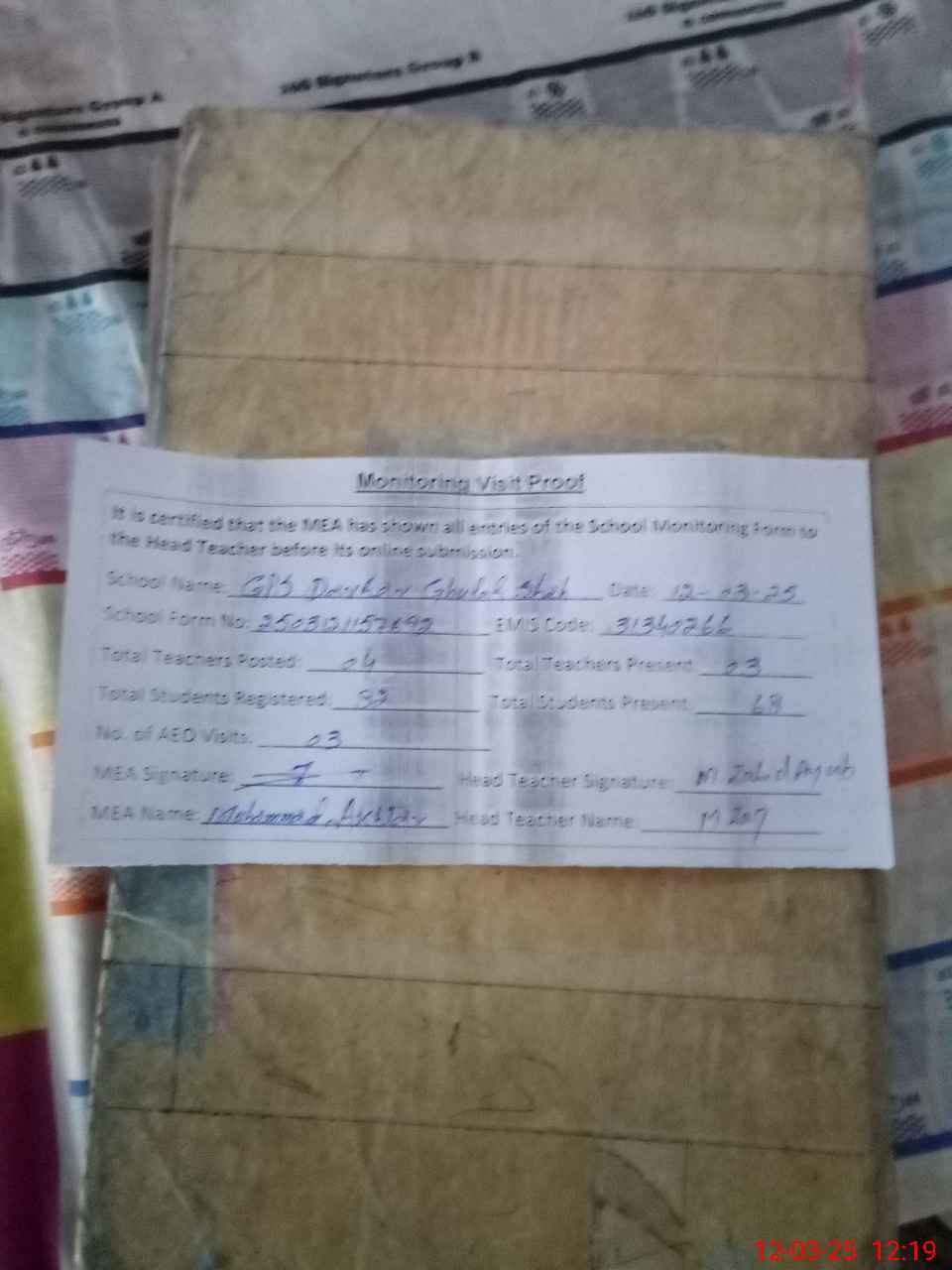 | Attendance Register | Head Teacher | MEA with School | Visit Proof |
