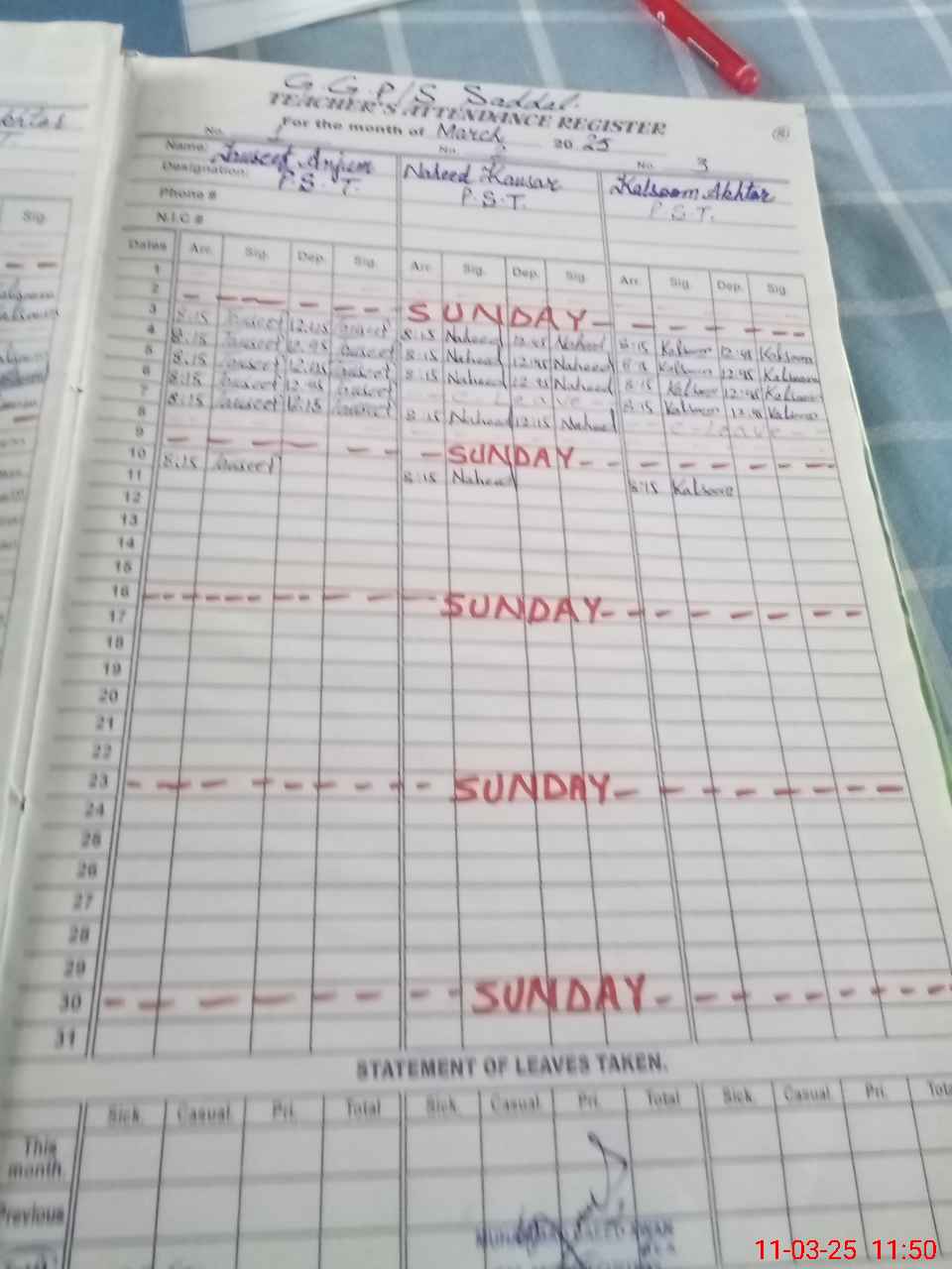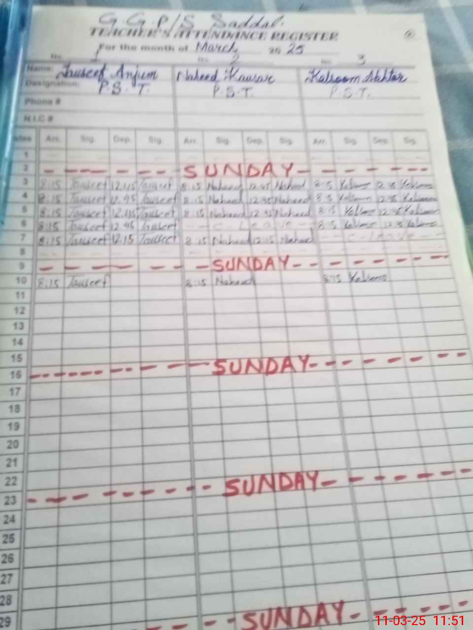| CNIC | Full Name | Designation | R/C | Absence During Last Calender Month |