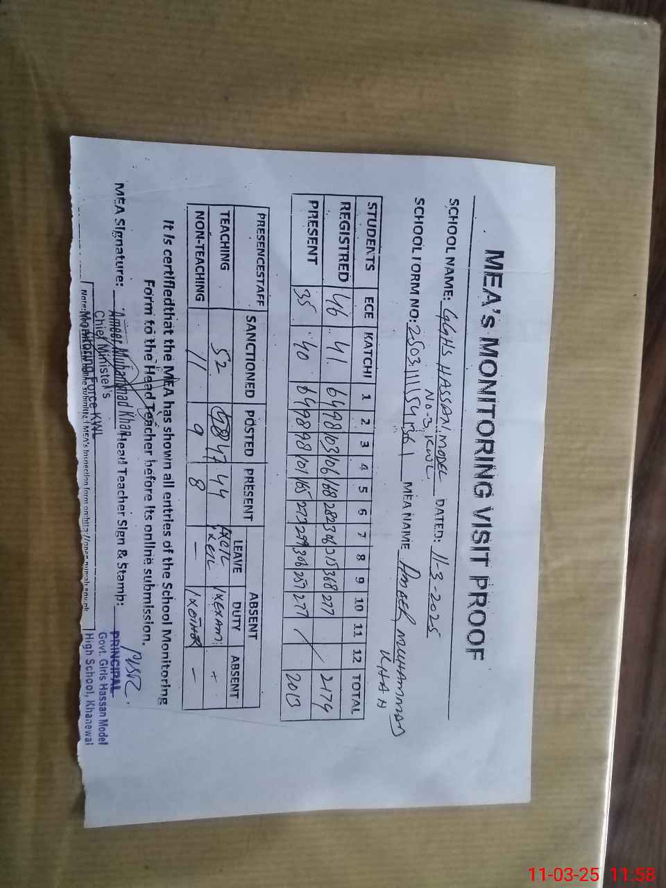 | Attendance Register | Head Teacher | MEA with School | Visit Proof |