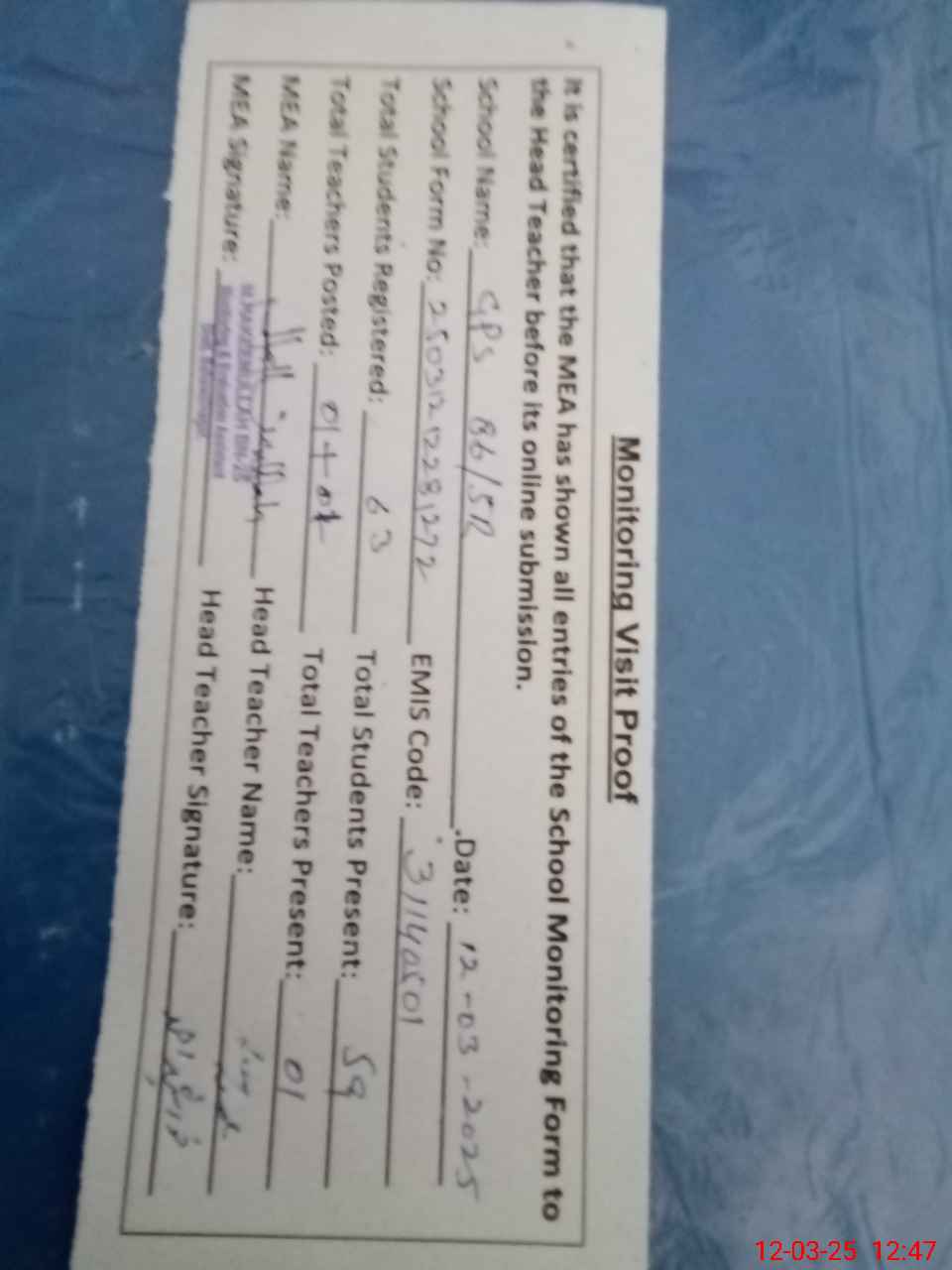 | EMIS Code: 31140501 | Name of School: GPS CHAK NO.86/5-R | |||