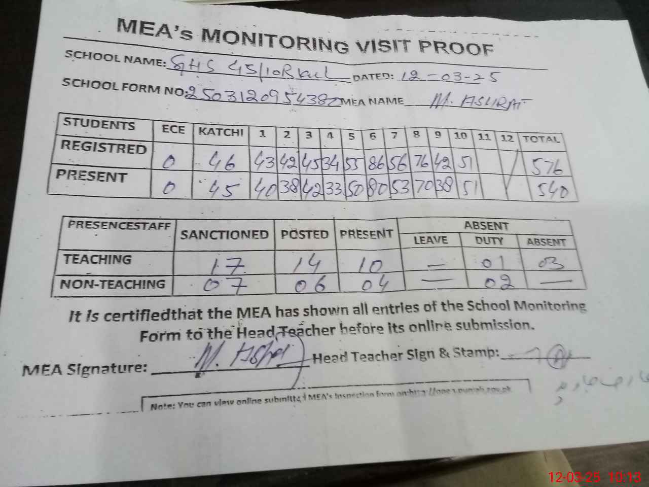 | Attendance Register | Head Teacher | MEA with School | Visit Proof |