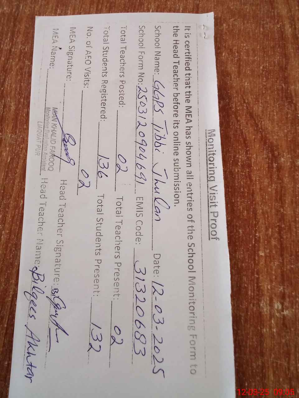 | Attendance Register | Head Teacher | MEA with School | Visit Proof |