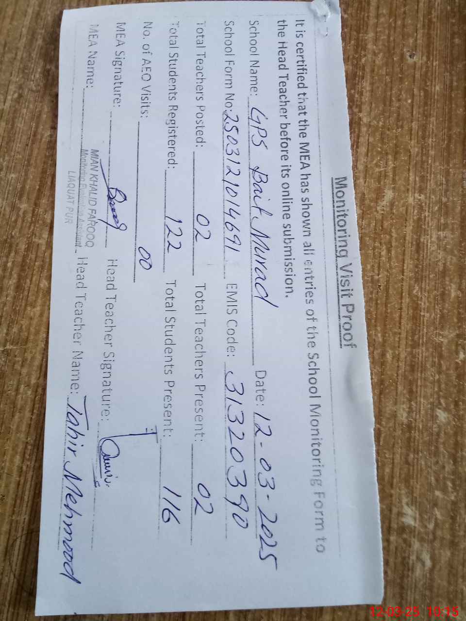 | EMIS Code: 31320390 | Name of School: GPS BAIT MURAD | |||
