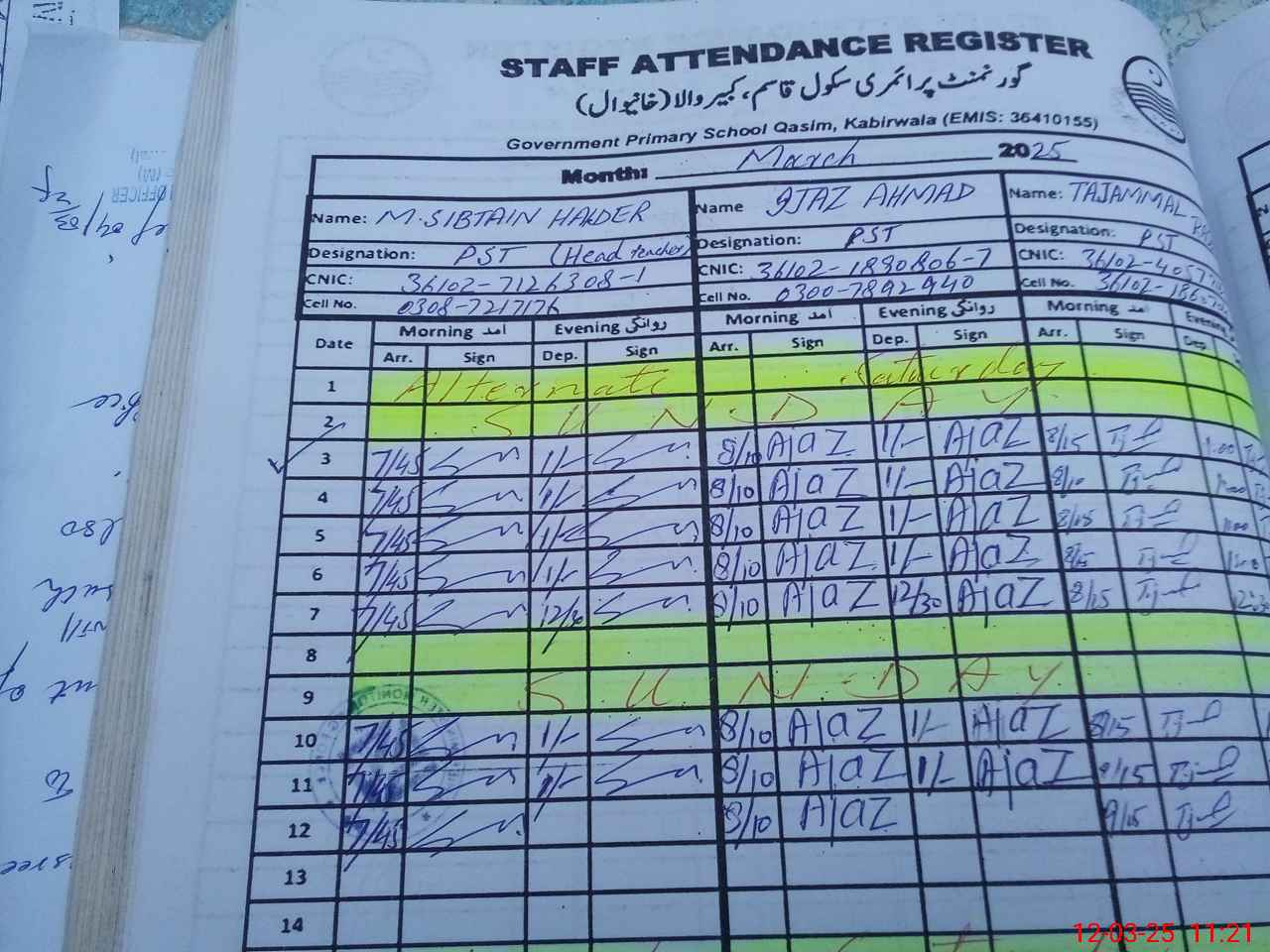 | CNIC | Full Name | Designation | R/C | Absence during last cal. month |