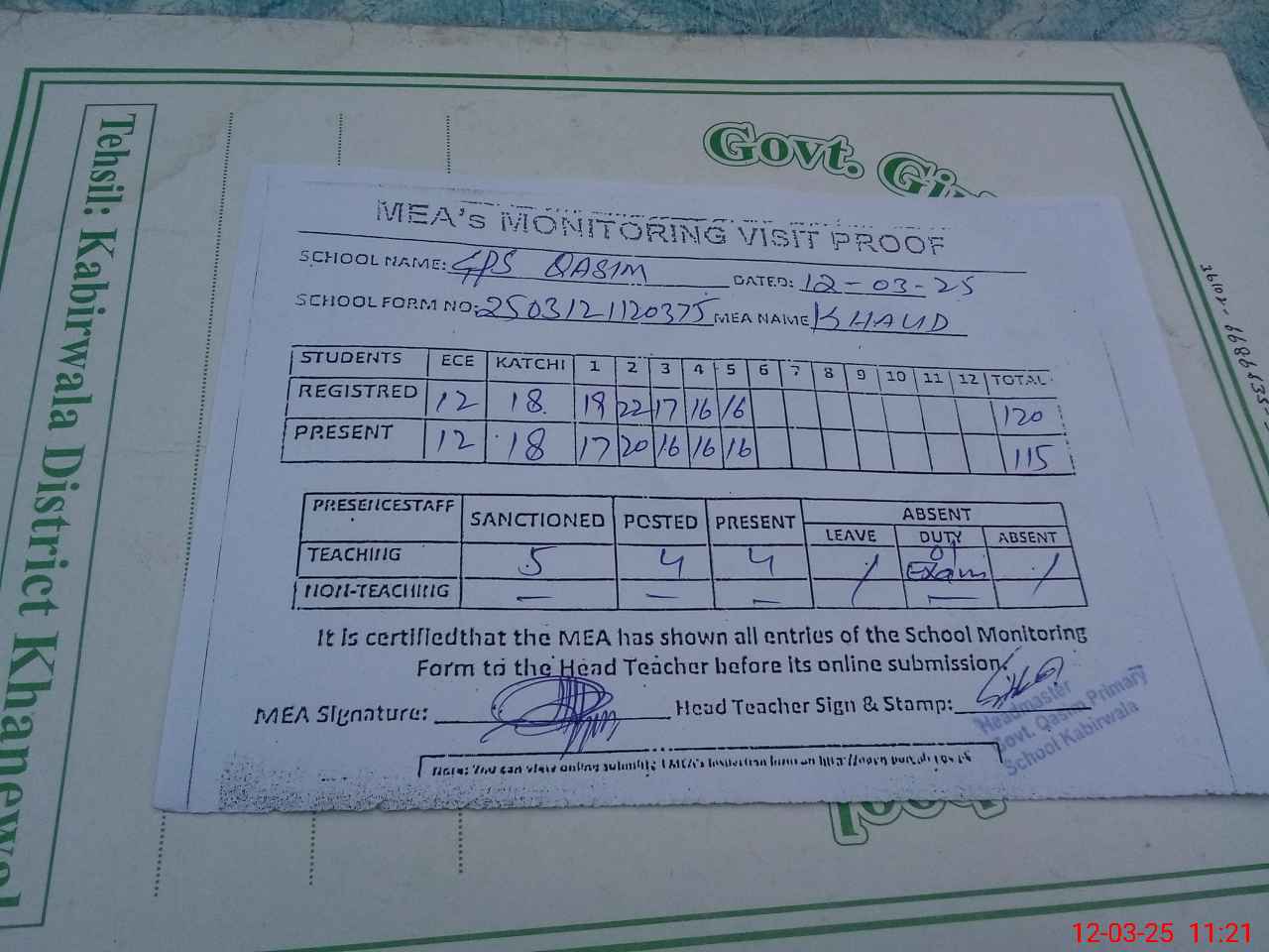 | Attendance Register | Head Teacher | MEA with School | Visit Proof |