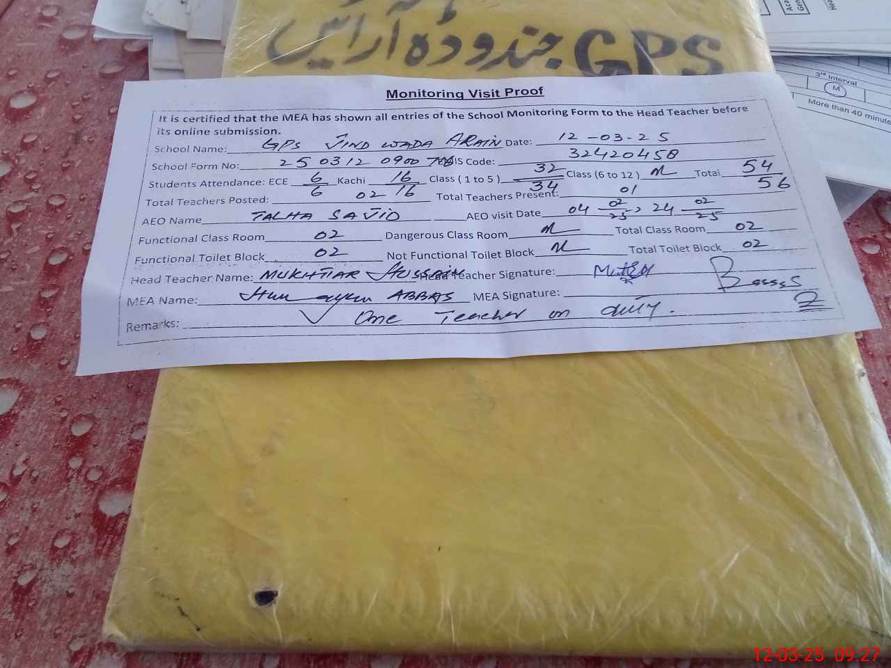 | Attendance Register | Head Teacher | MEA with School | Visit Proof |