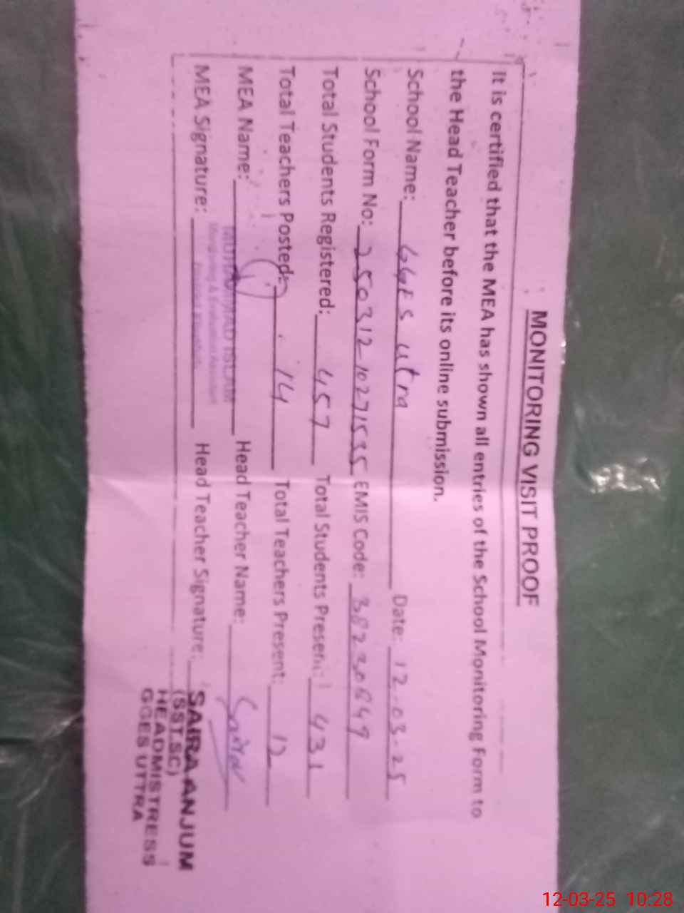 | Attendance Register | Head Teacher | MEA with School | Visit Proof |