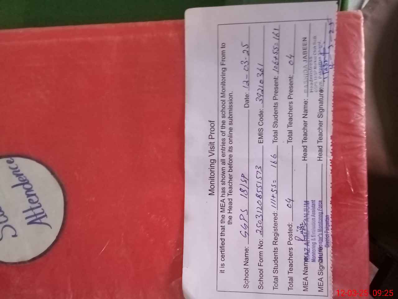 | Attendance Register | Head Teacher | MEA with School | Visit Proof |