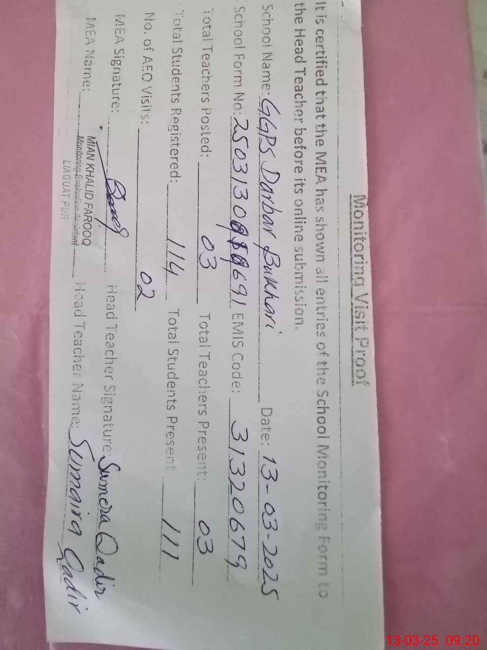 | EMIS Code: 31320679 | Name of School: GGPS DARBAR BUKHARI FAZIL PUR | |||