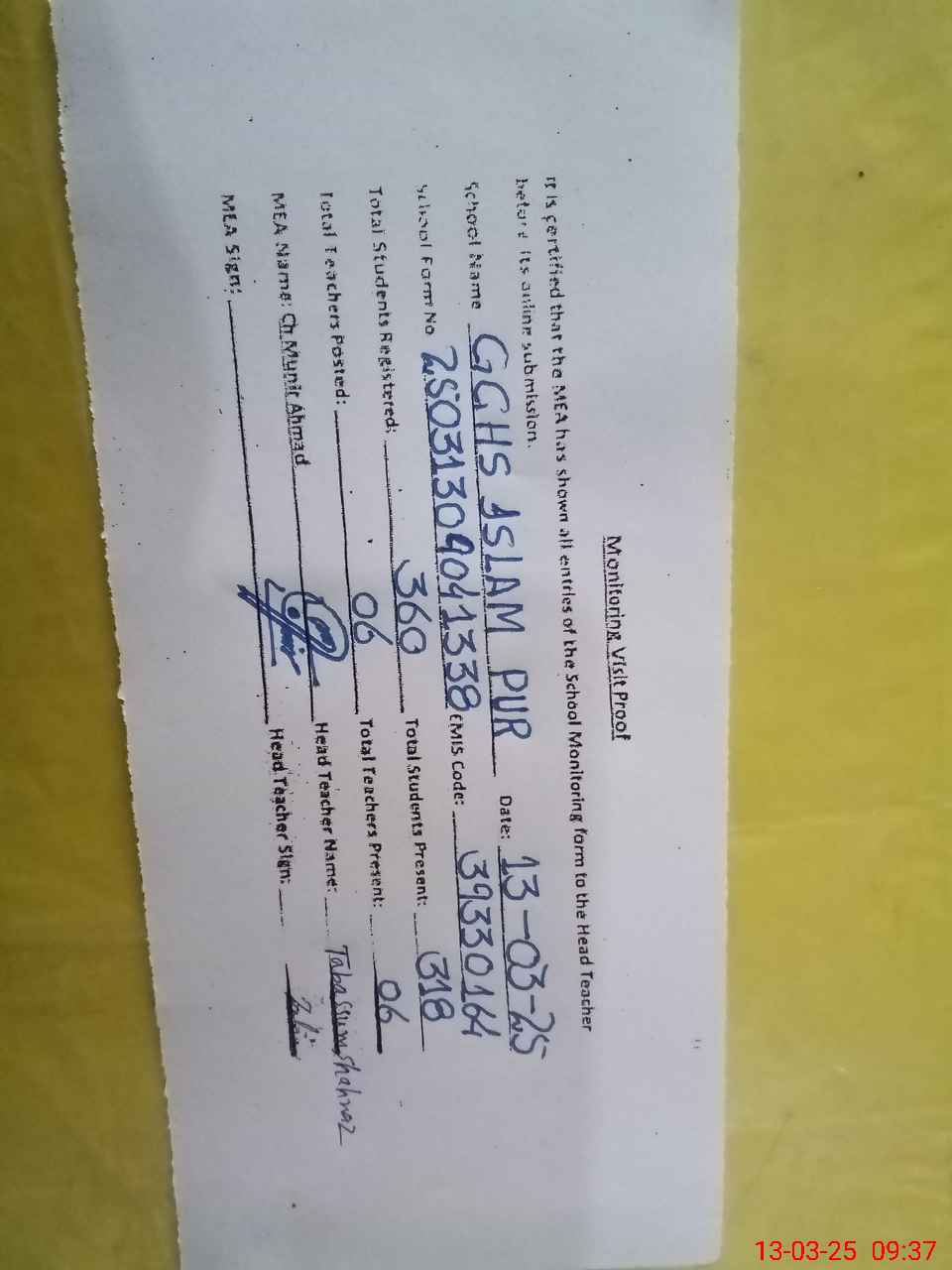 | Attendance Register | Head Teacher | MEA with School | Visit Proof |
