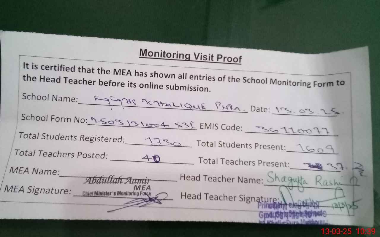 | Attendance Register | Head Teacher | MEA with School | Visit Proof |