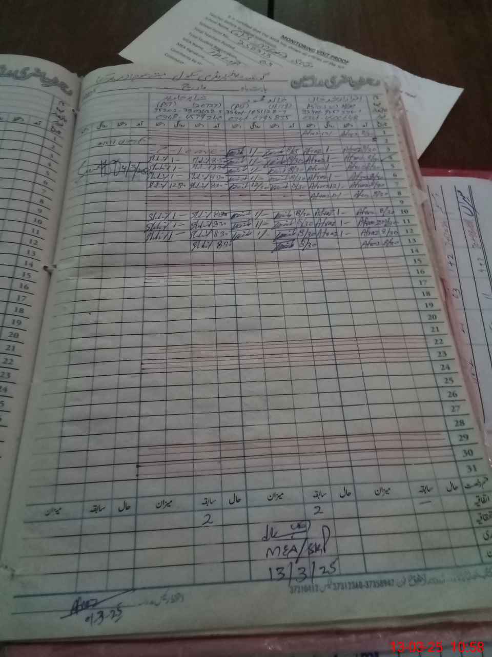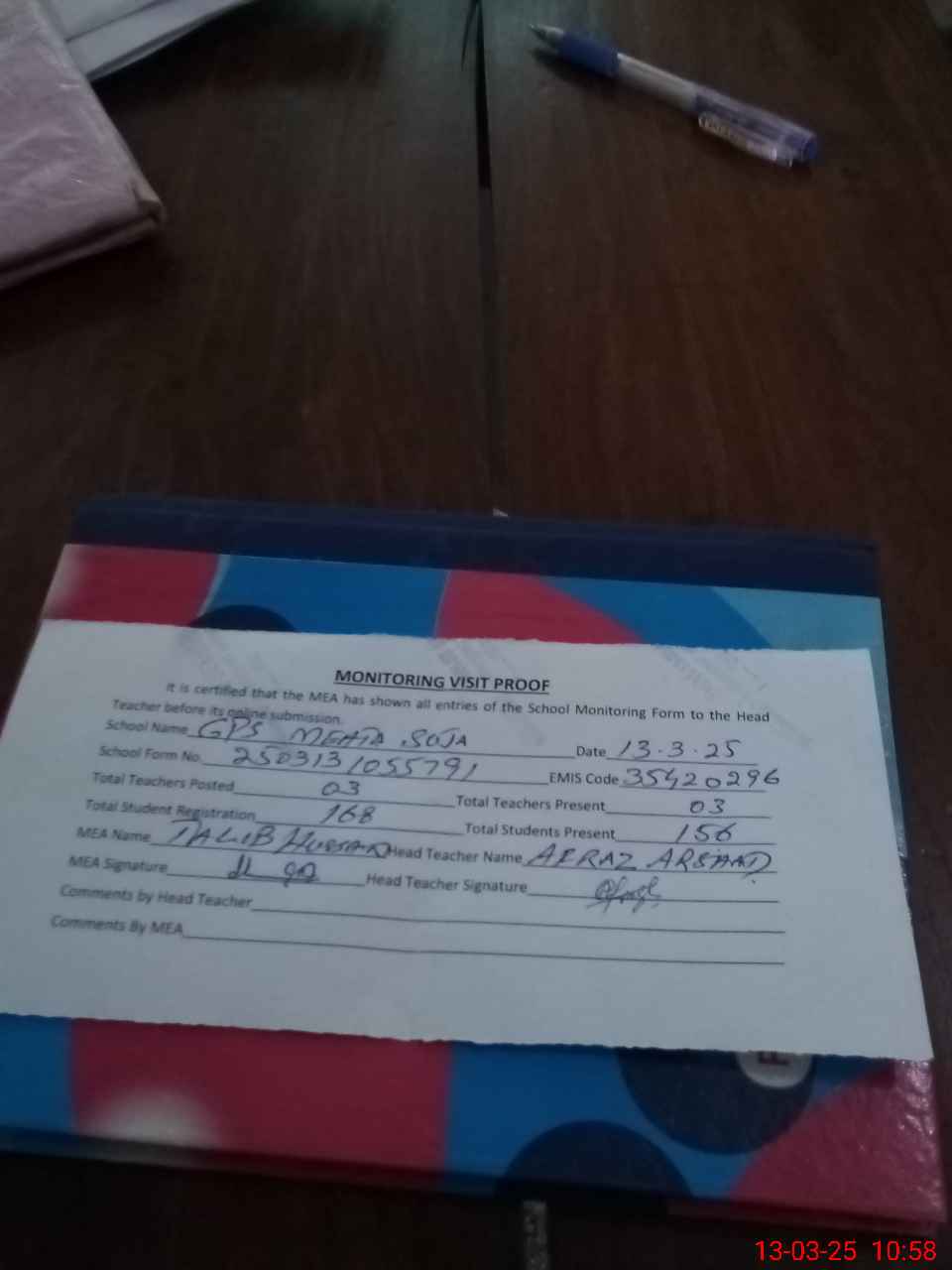 | Attendance Register | Head Teacher | MEA with School | Visit Proof |