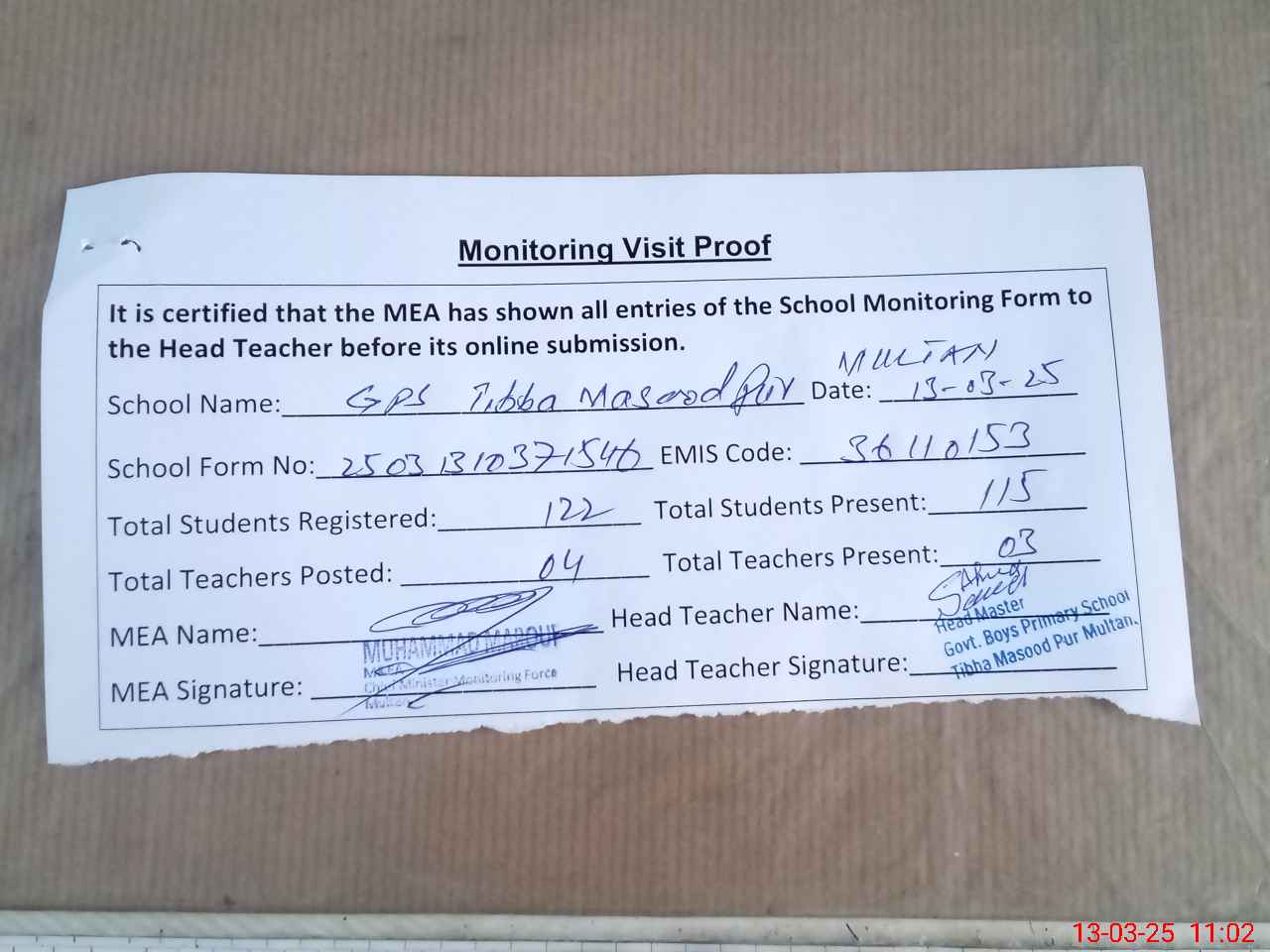 | Attendance Register | Head Teacher | MEA with School | Visit Proof |