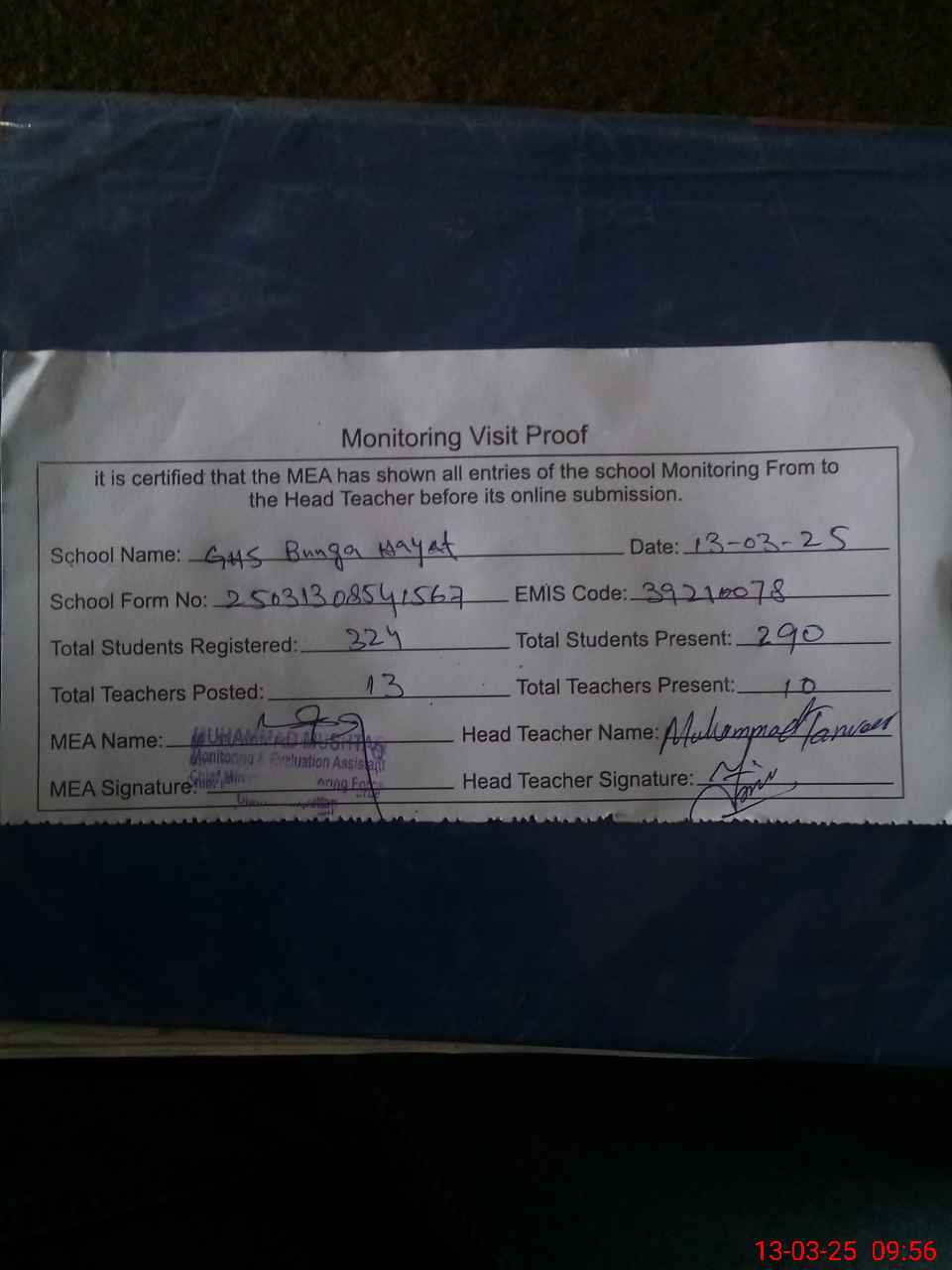 | EMIS Code: 39210078 | Name of School: GHS BUNGA HAYAT | |||