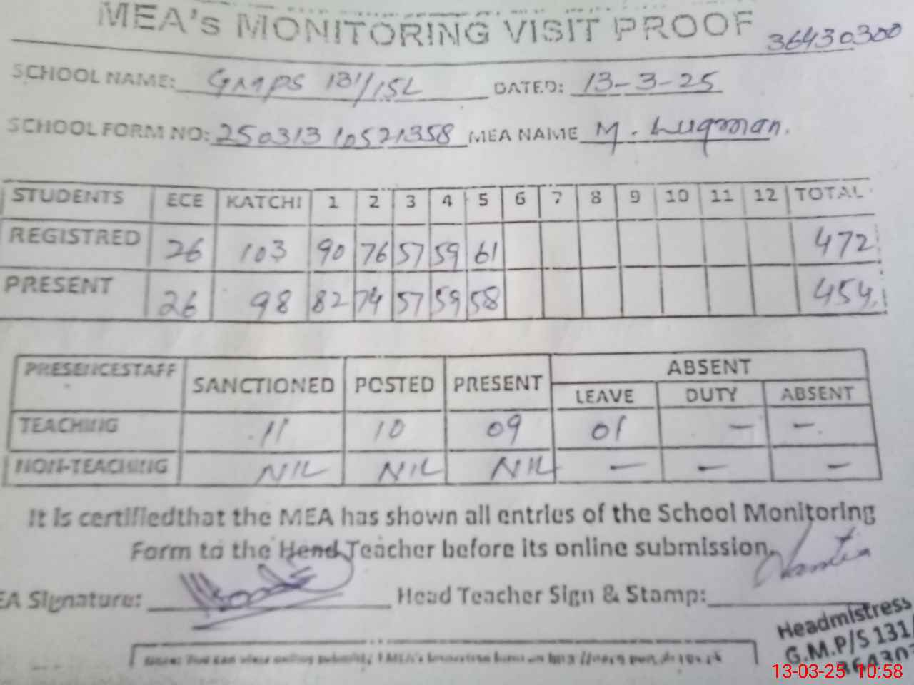 | Attendance Register | Head Teacher | MEA with School | Visit Proof |