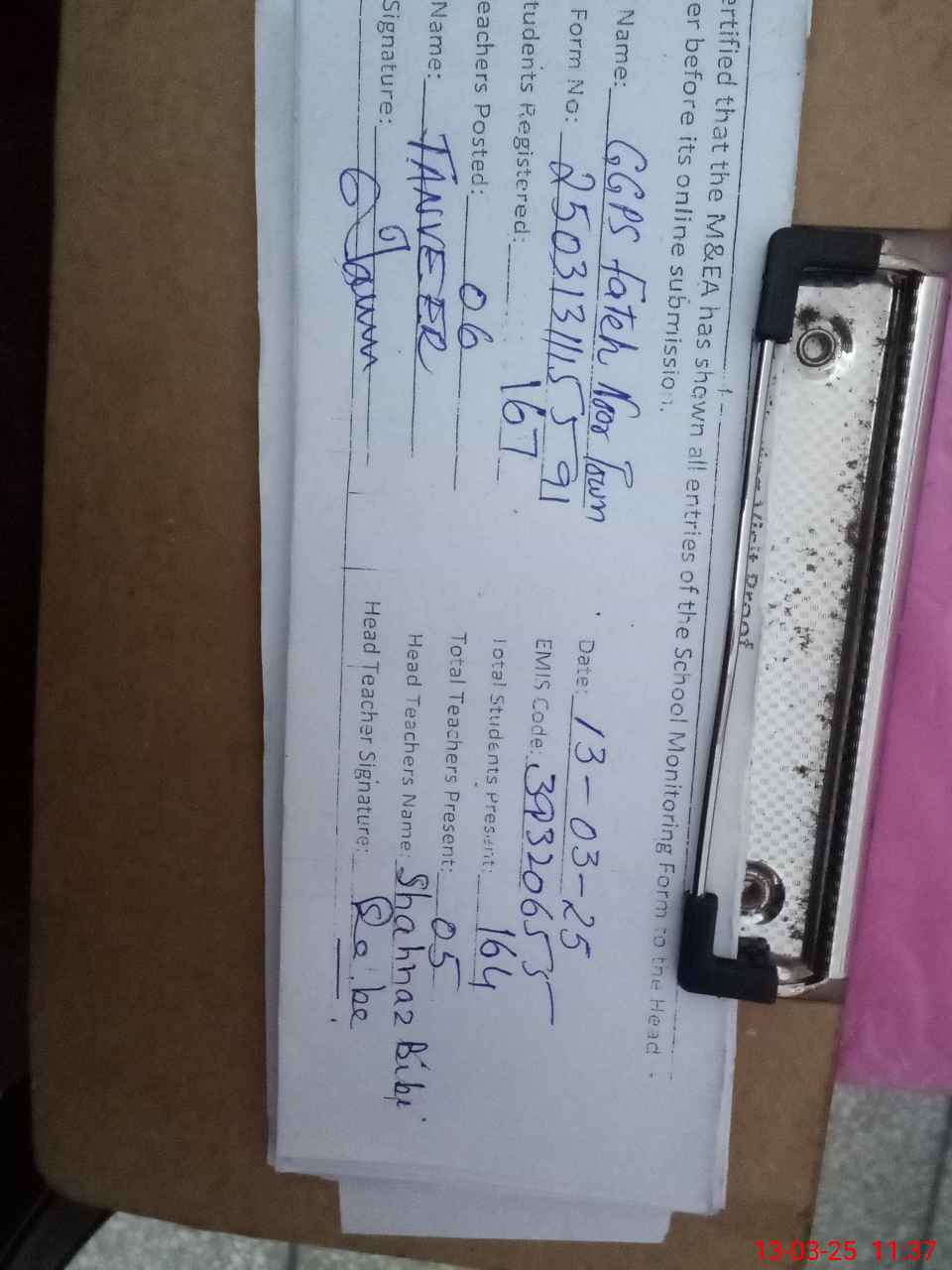 | Name: SH**** BI**** Designation: (School Headmaster's/Headmistress's) E S T Phone/Cell Number: 03**** |