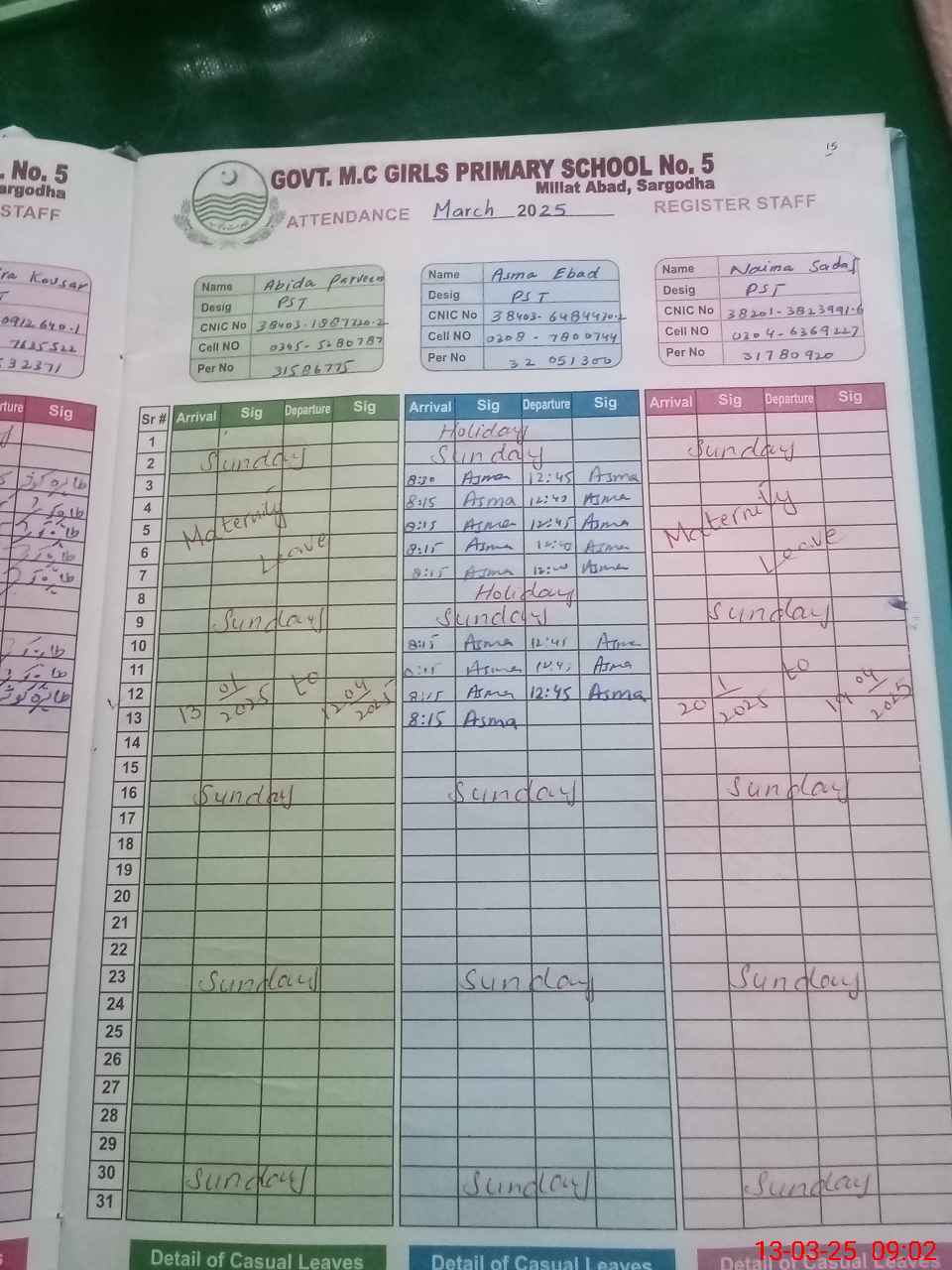 | CNIC | Full Name | Designation | R/C | Absence During Last Calender Month |