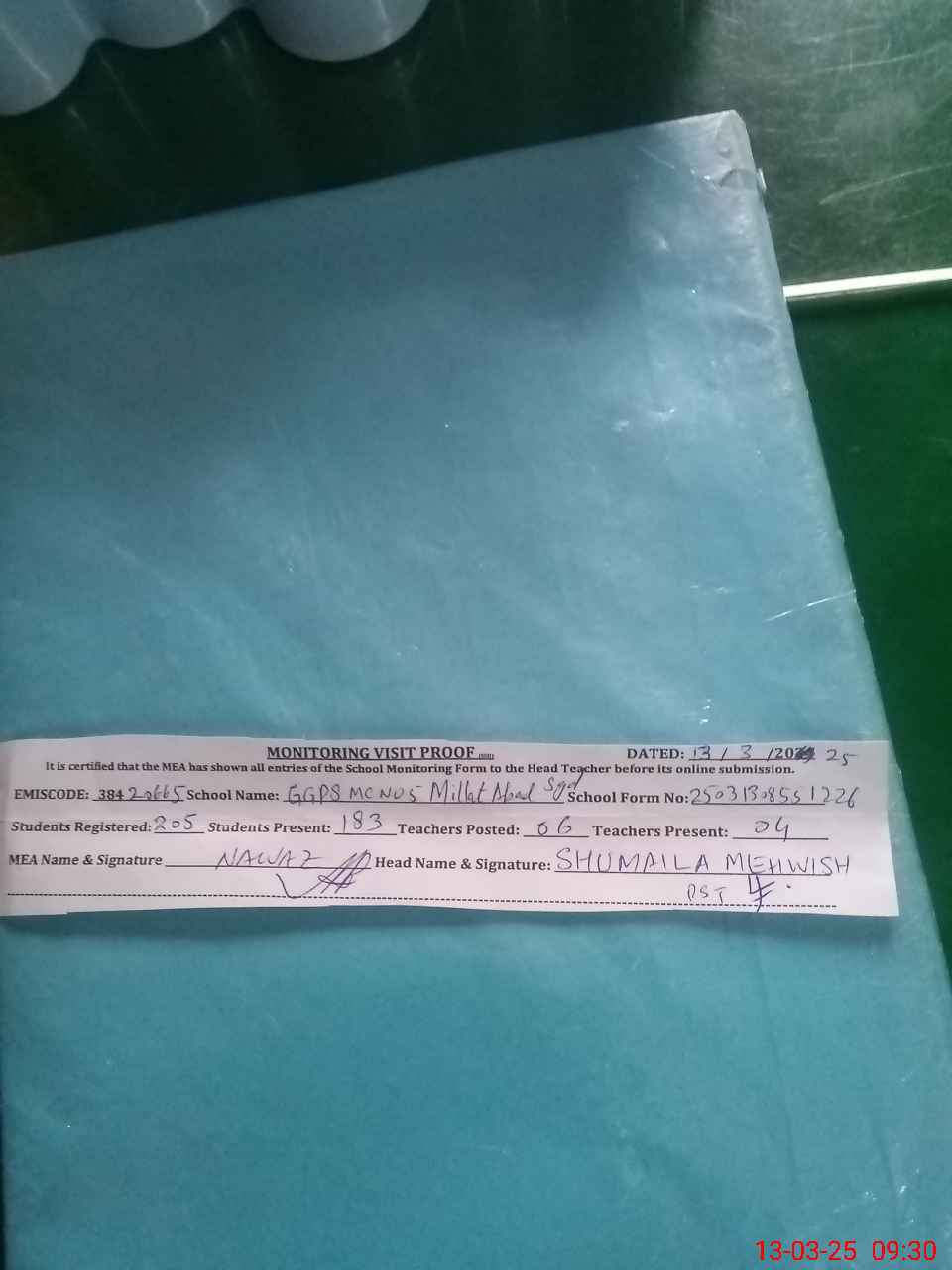 | Attendance Register | Head Teacher | MEA with School | Visit Proof |
