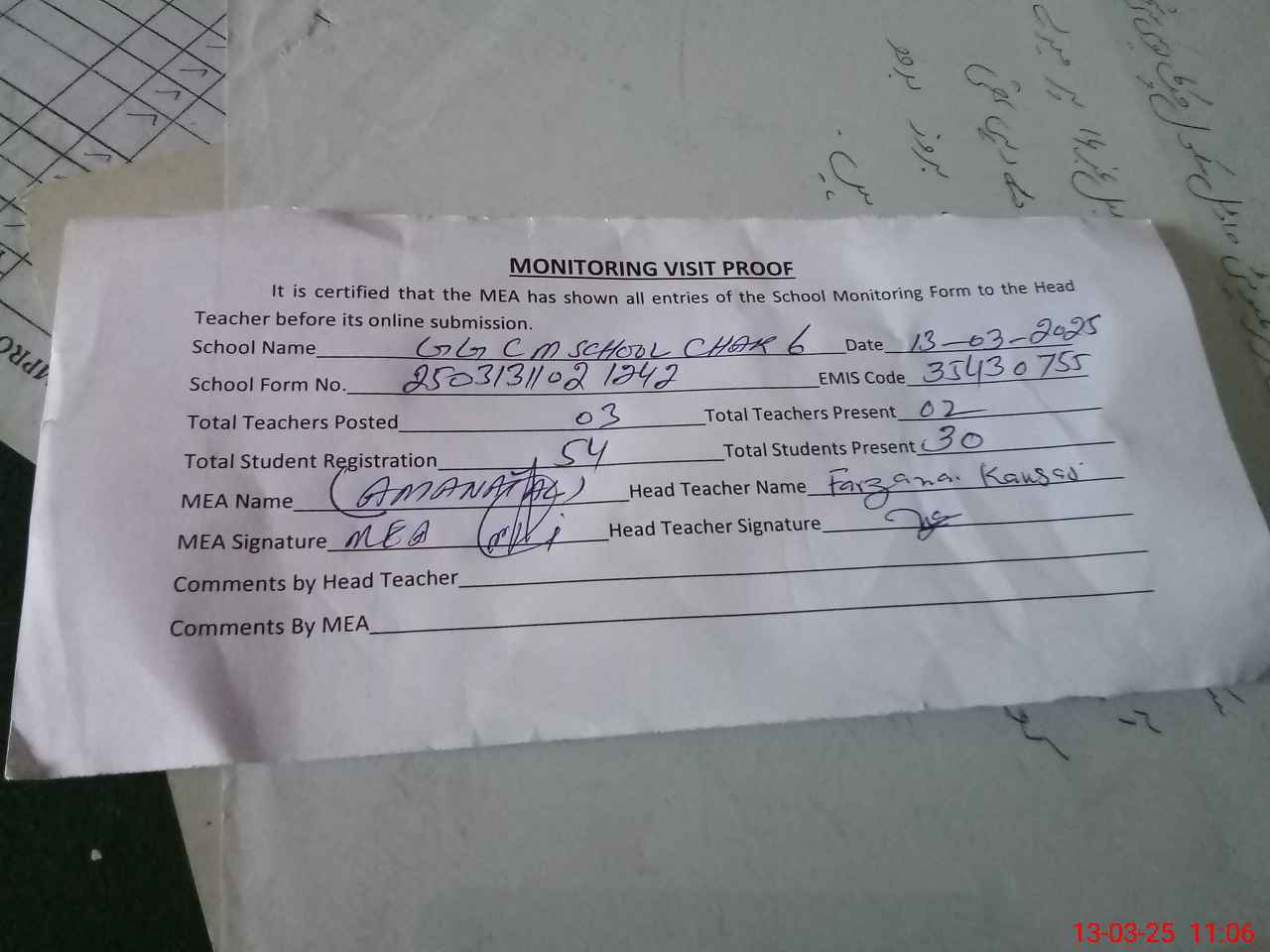 | Attendance Register | Head Teacher | MEA with School | Visit Proof |