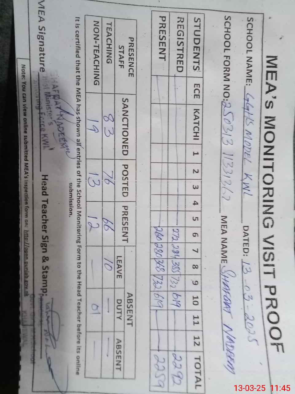 | Attendance Register | Head Teacher | MEA with School | Visit Proof |