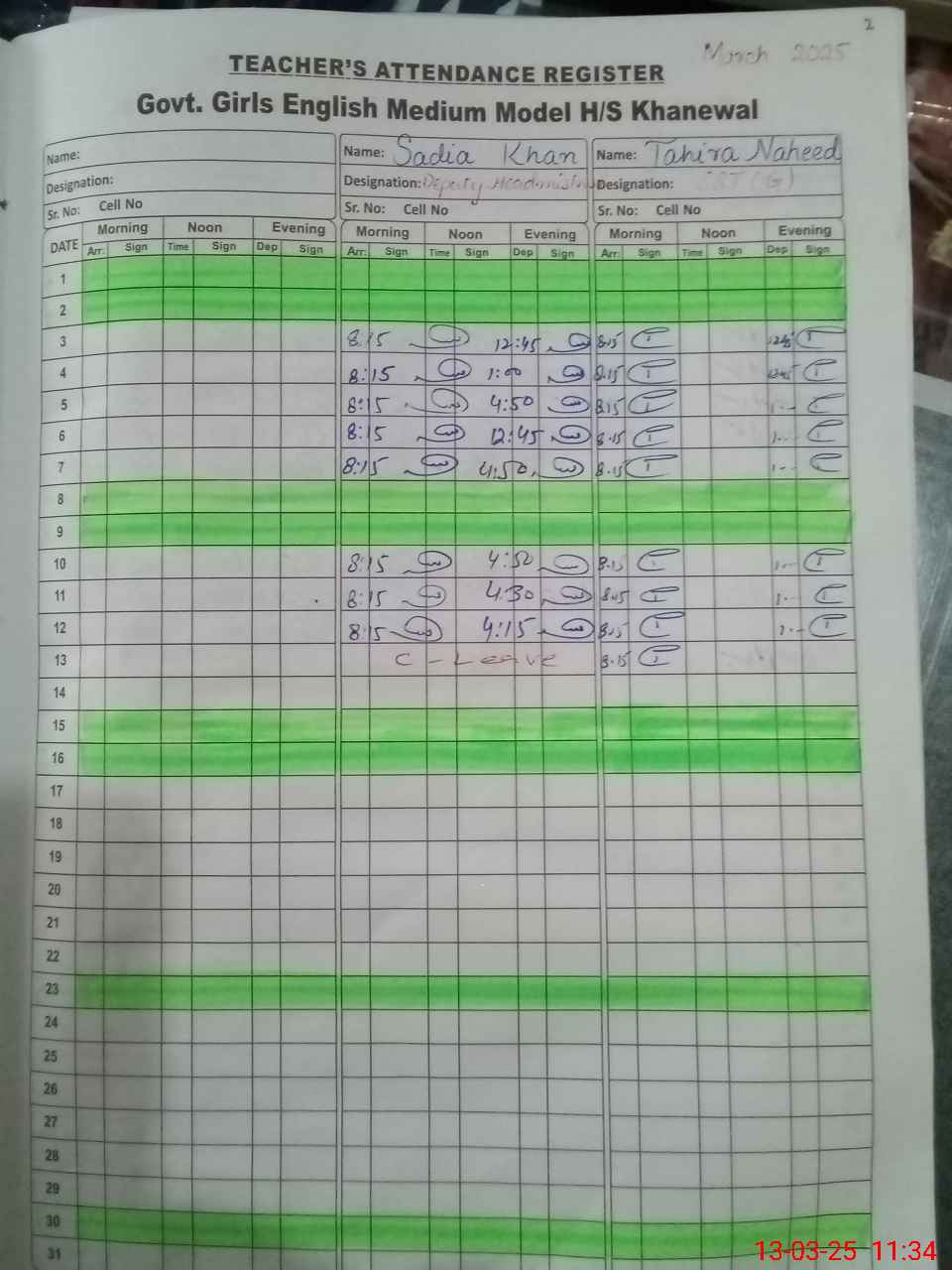 | CNIC | Full Name | Designation | R/C | Absence During Last Calender Month |
