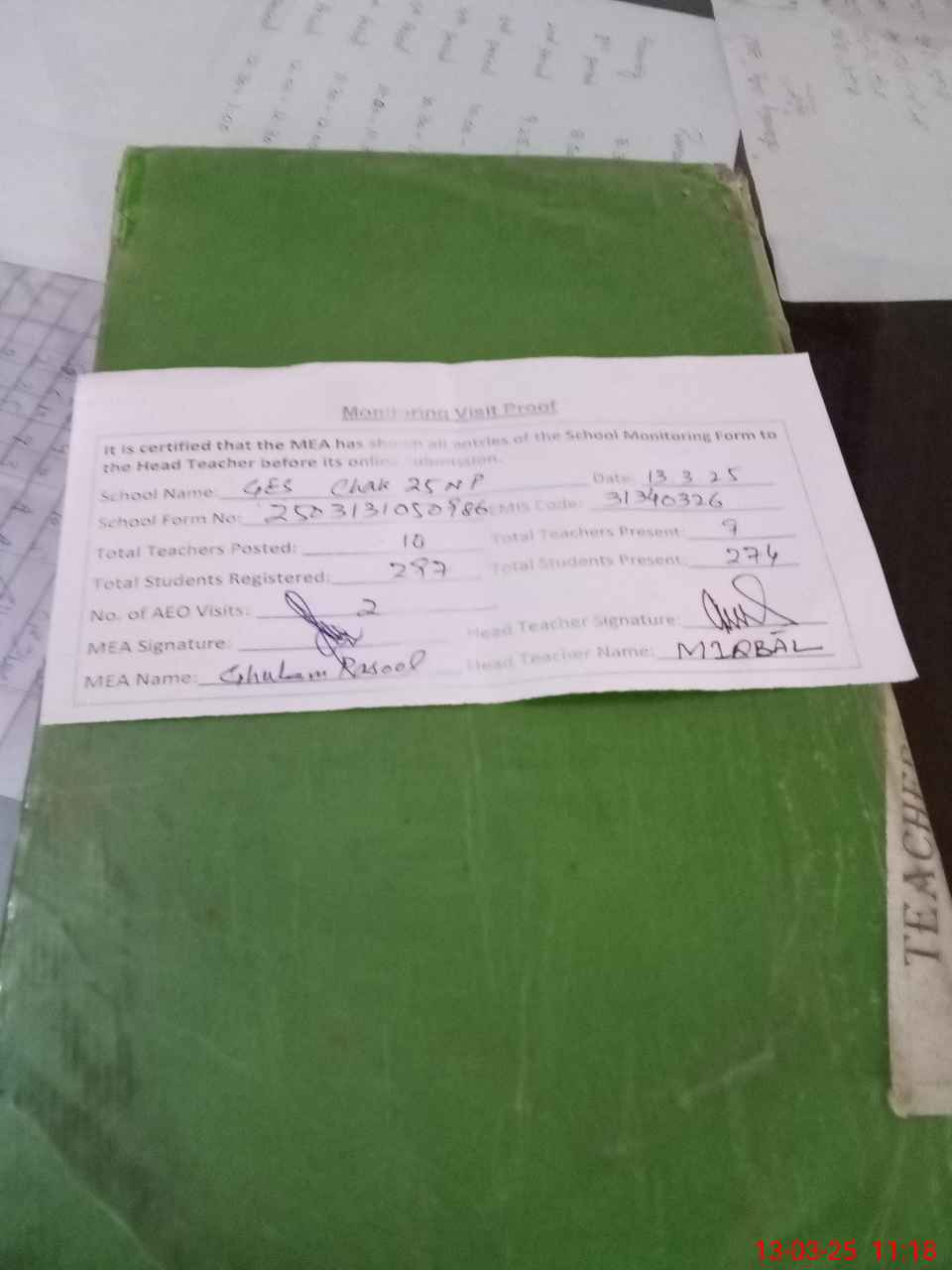 | EMIS Code: 31340326 | Name of School: GES CHAK NO 25/NP | |||