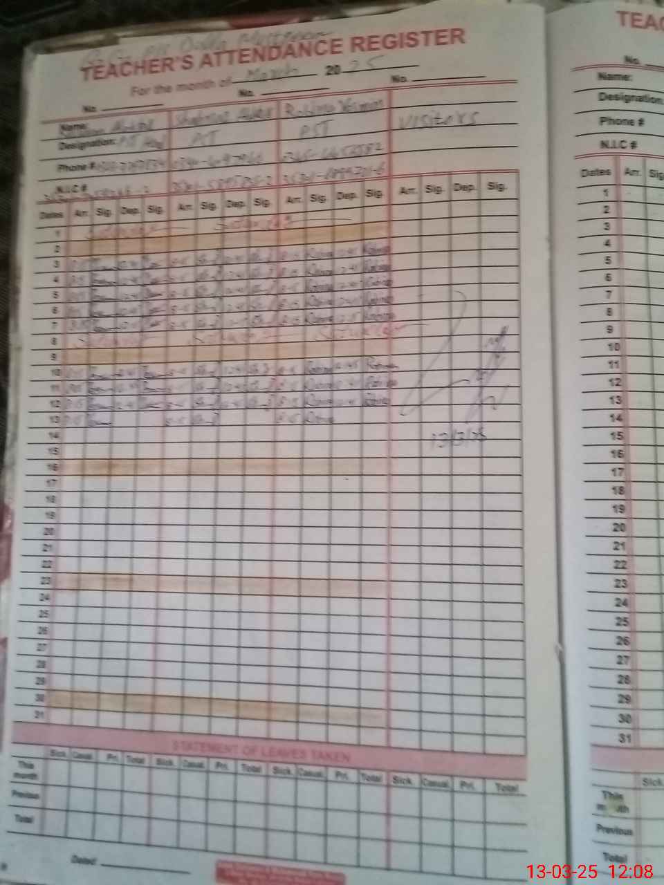 | CNIC | Full Name | Designation | R/C | Absence During Last Calender Month |