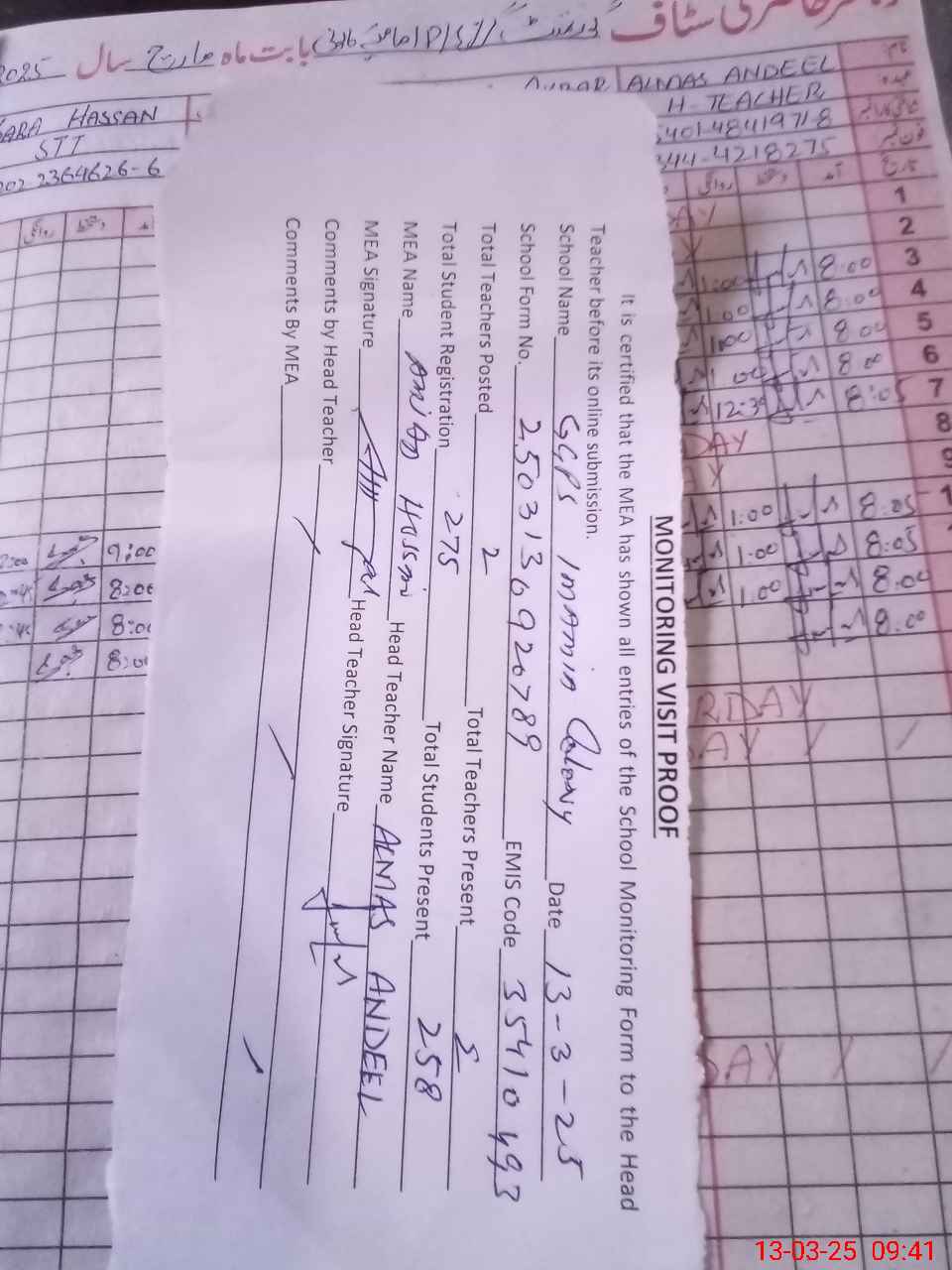 | Attendance Register | Head Teacher | MEA with School | Visit Proof |