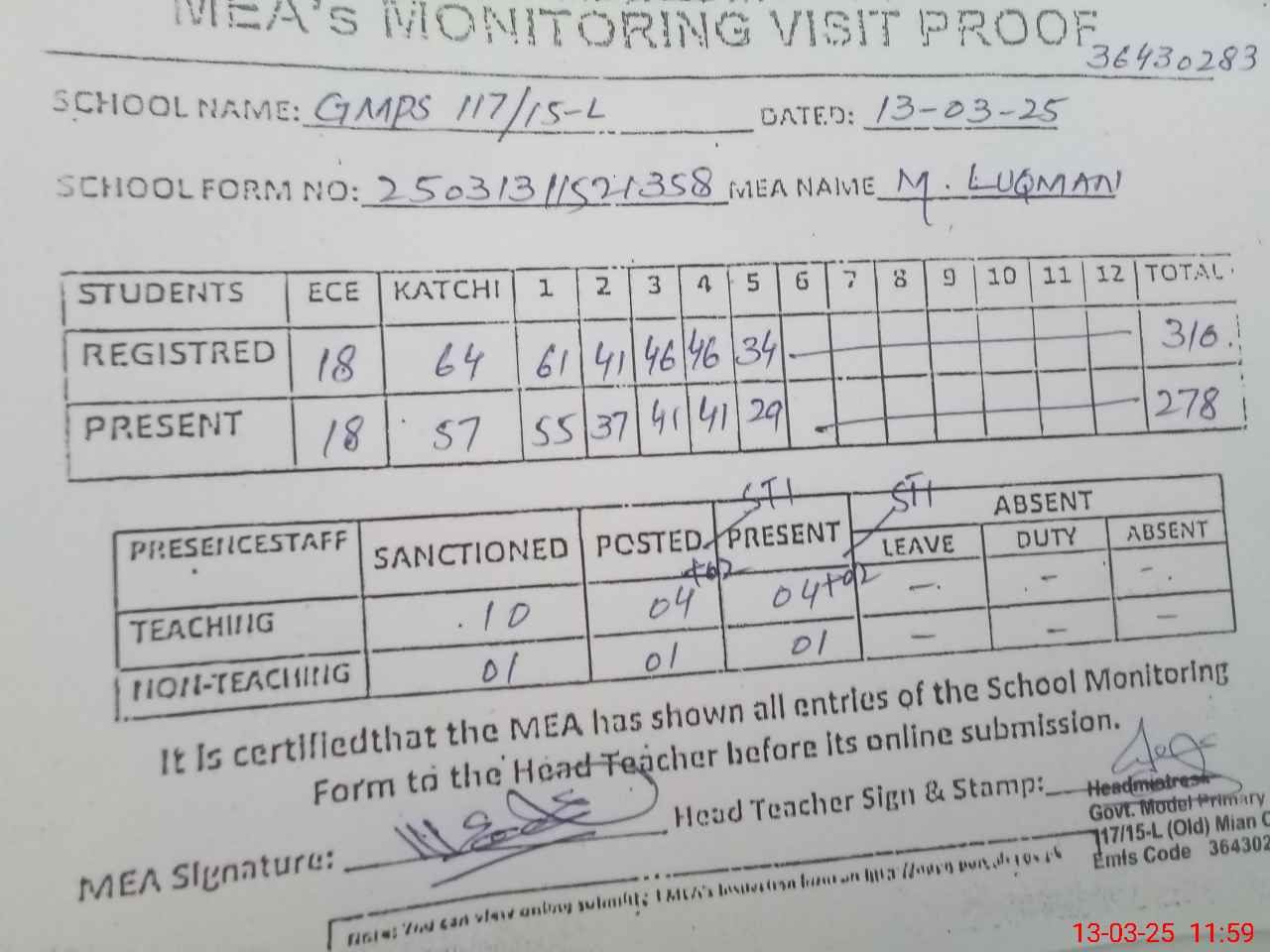 | Remarks (Use Separate Page if Required): STI Fouzia Gulnaz and STI Zukhruf were also present in the school Both are temporary added as teacher | |||||