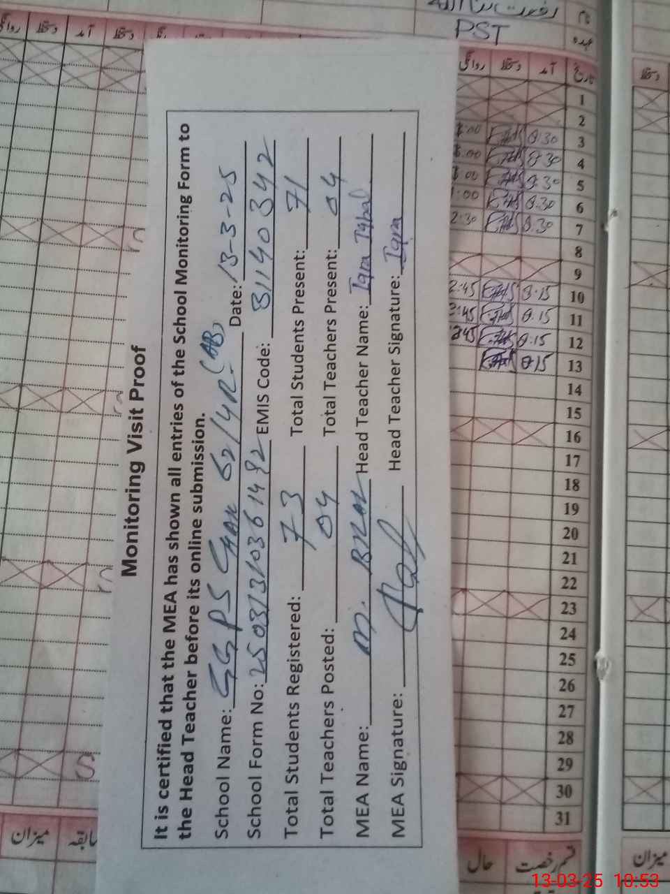 | Attendance Register | Head Teacher | MEA with School | Visit Proof |
