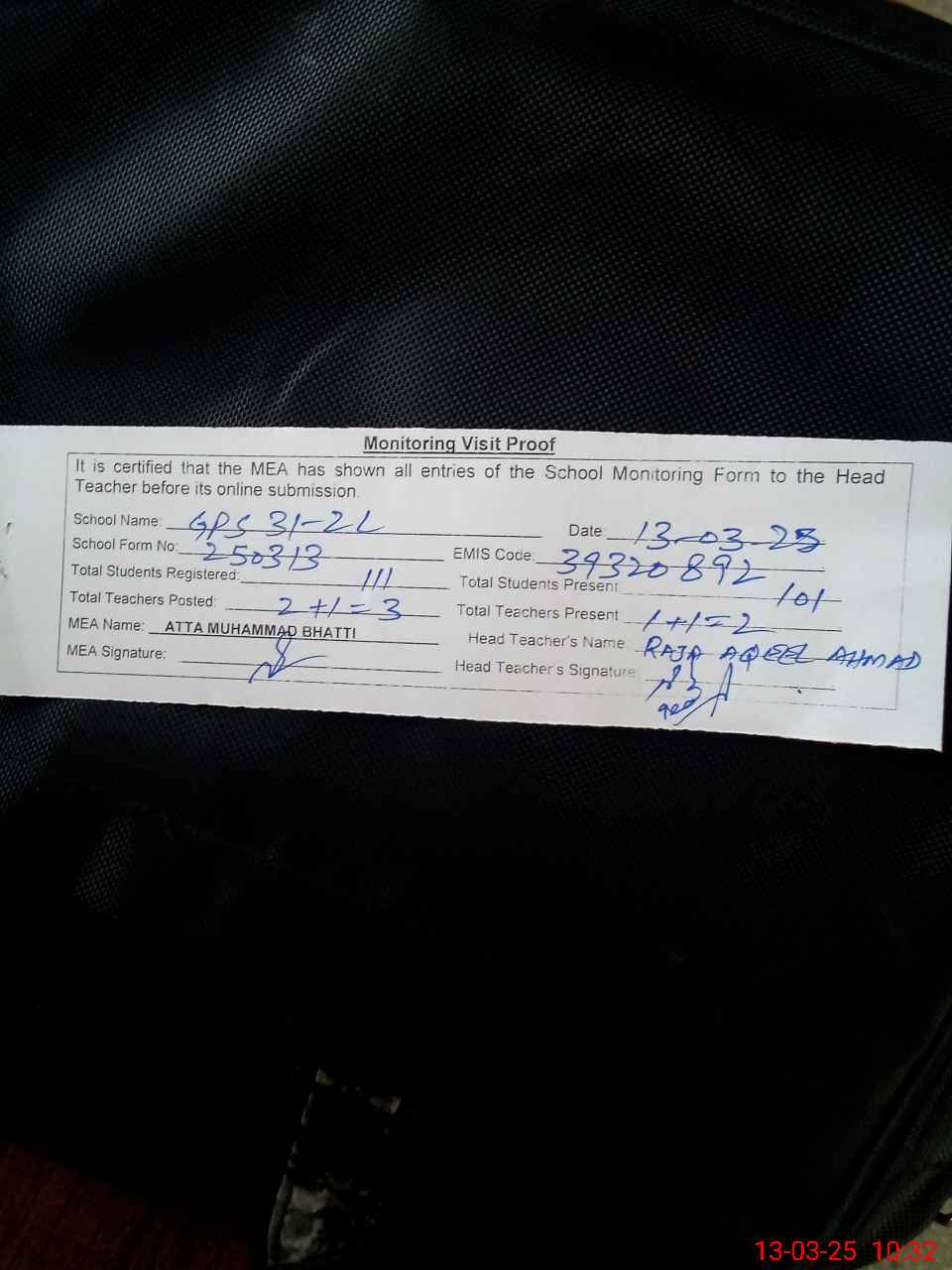 | EMIS Code: 39320892 | Name of School: GPS CHAK NO. 31/2-L | |||