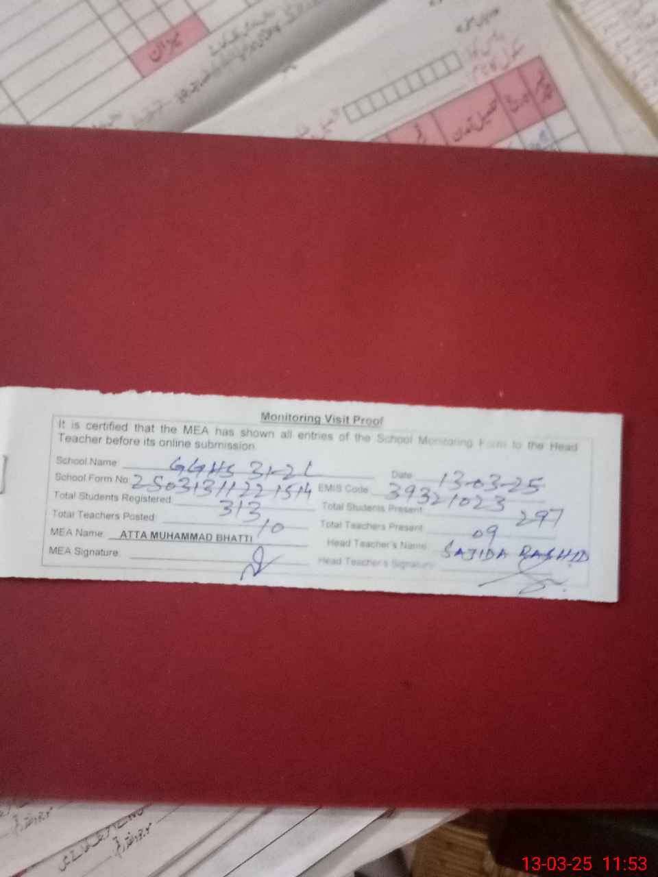 | Attendance Register | Head Teacher | MEA with School | Visit Proof |