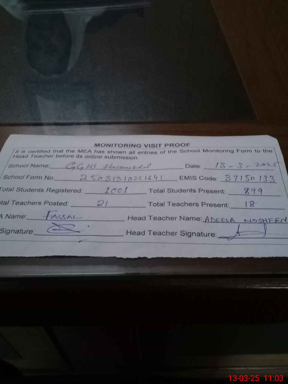 | Attendance Register | Head Teacher | MEA with School | Visit Proof |