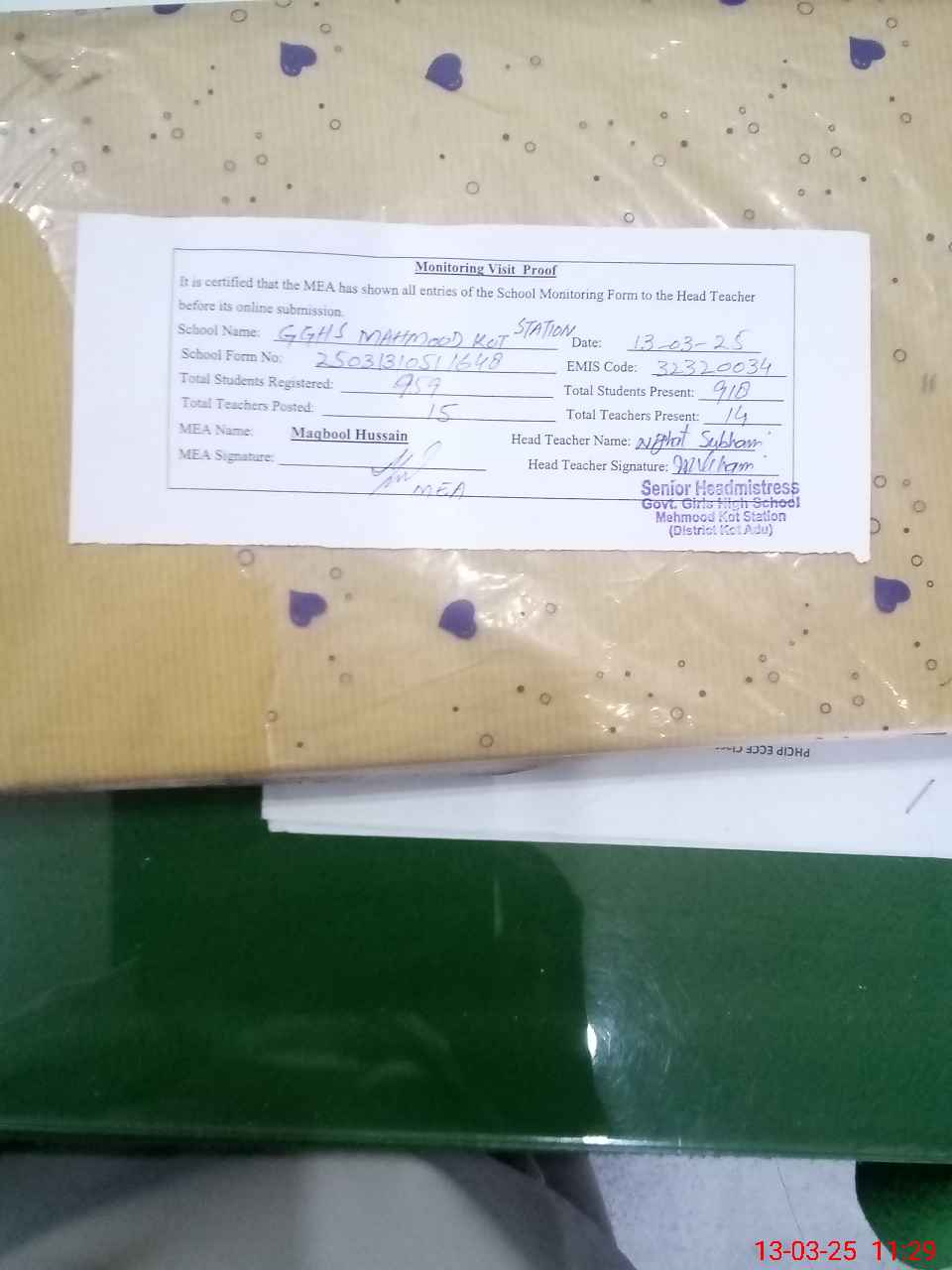 | EMIS Code: 32320034 | Name of School: GGHS MAHMOOD KOT STATION | |||