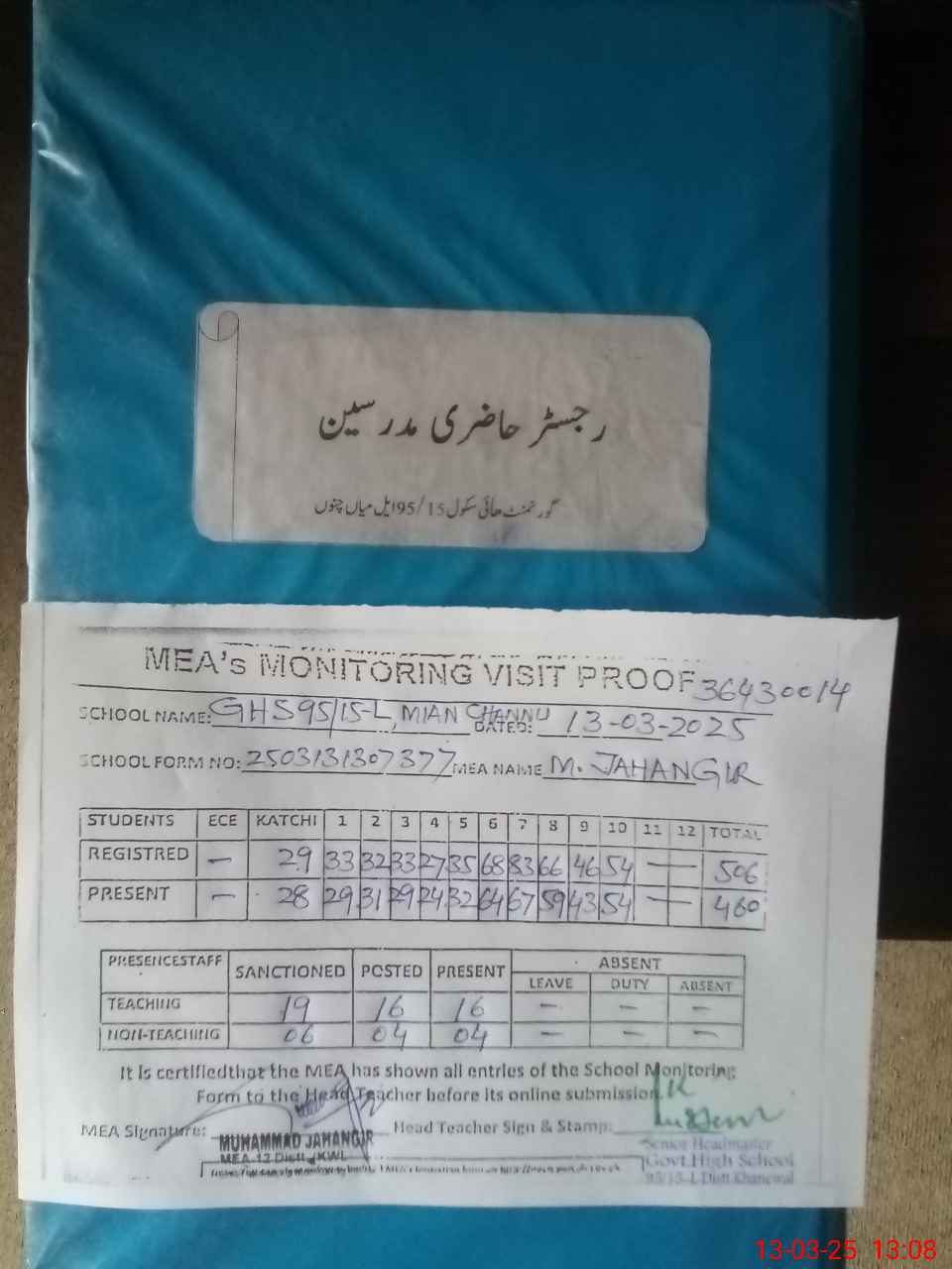 | EMIS Code: 36430014 | Name of School: GHS 95/15-L, MIAN CHANNU | |||