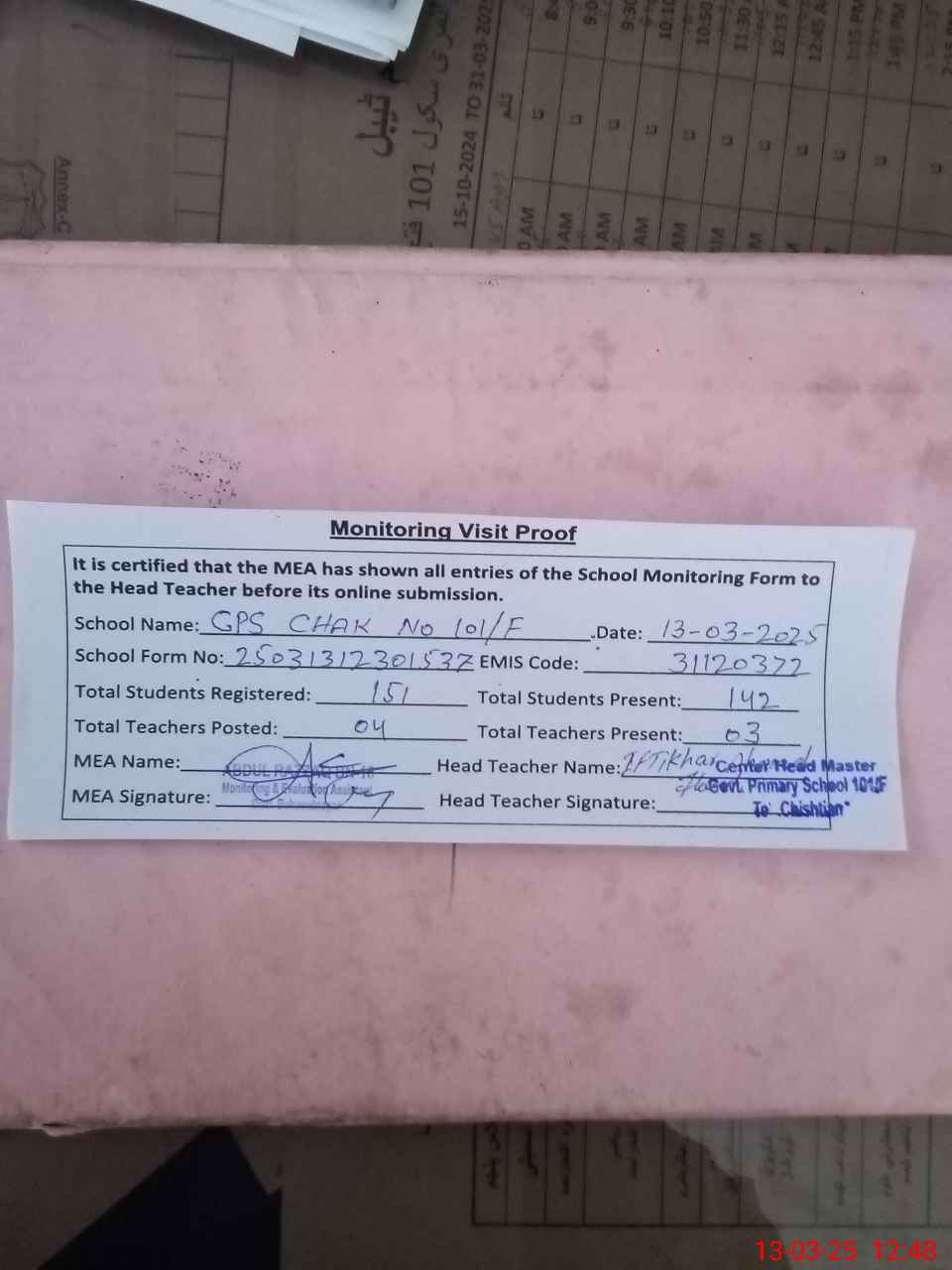 | EMIS Code: 31120372 | Name of School: GPS CHAK NO 101 F | |||