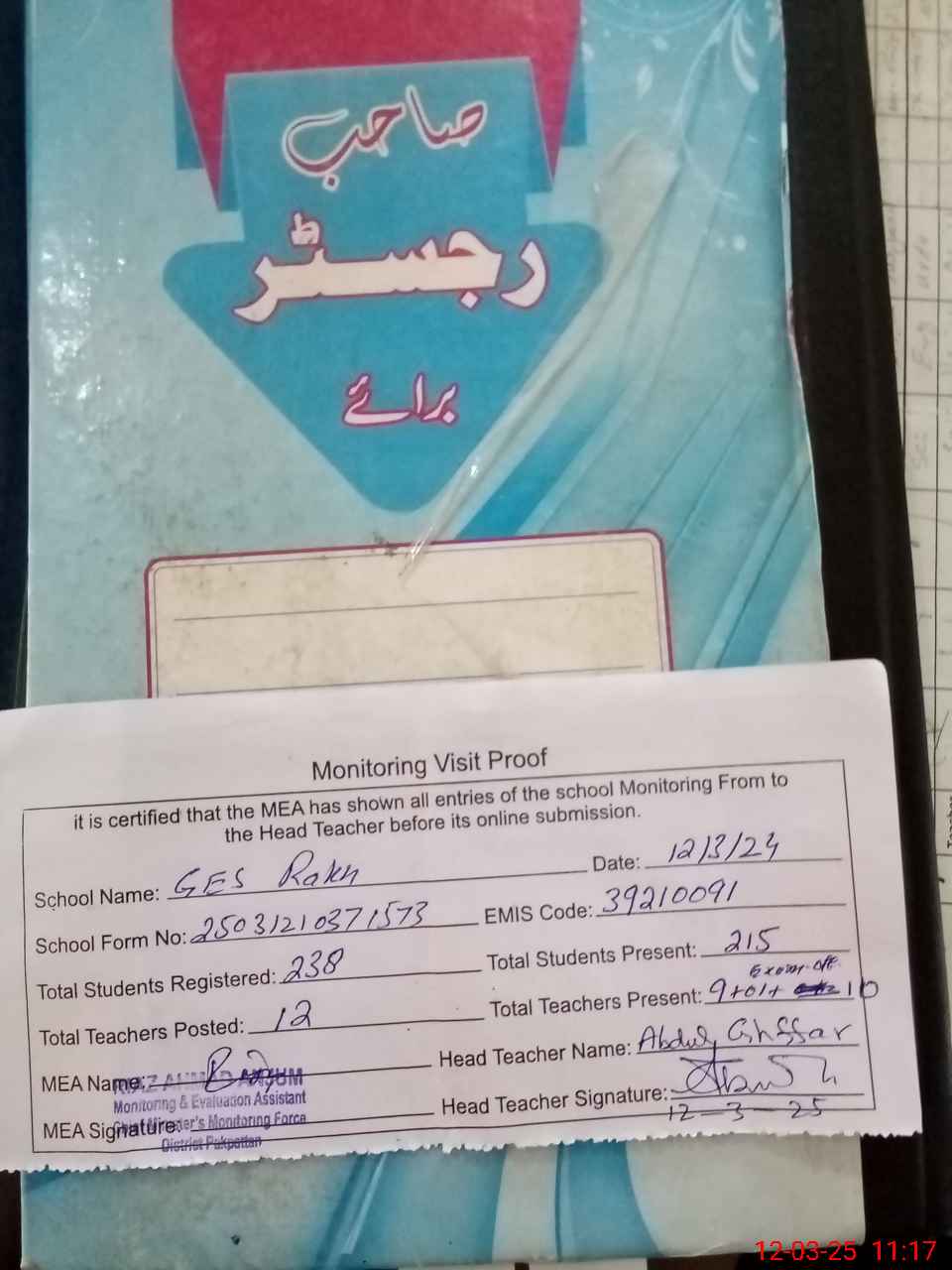 | Attendance Register | Head Teacher | MEA with School | Visit Proof |