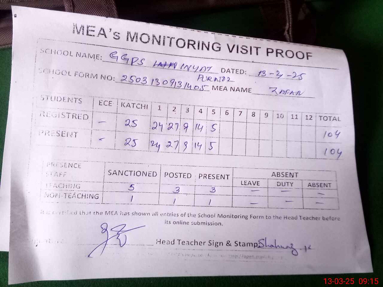| Attendance Register | Head Teacher | MEA with School | Visit Proof |