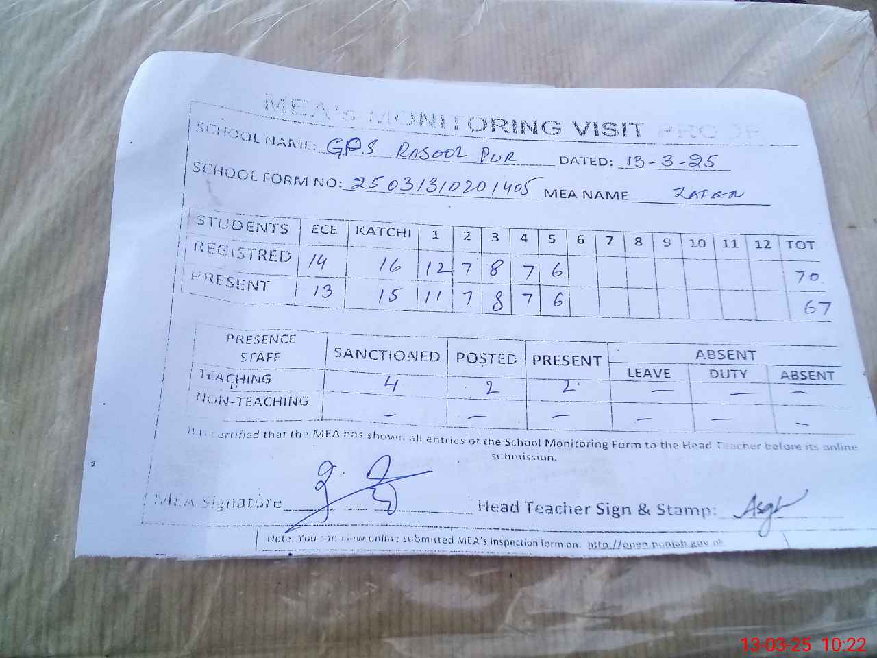 | Attendance Register | Head Teacher | MEA with School | Visit Proof |