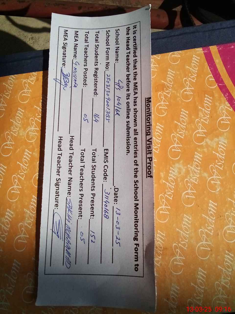 | EMIS Code: 31140168 | Name of School: GPS CHAK NO 104/6-R | |||