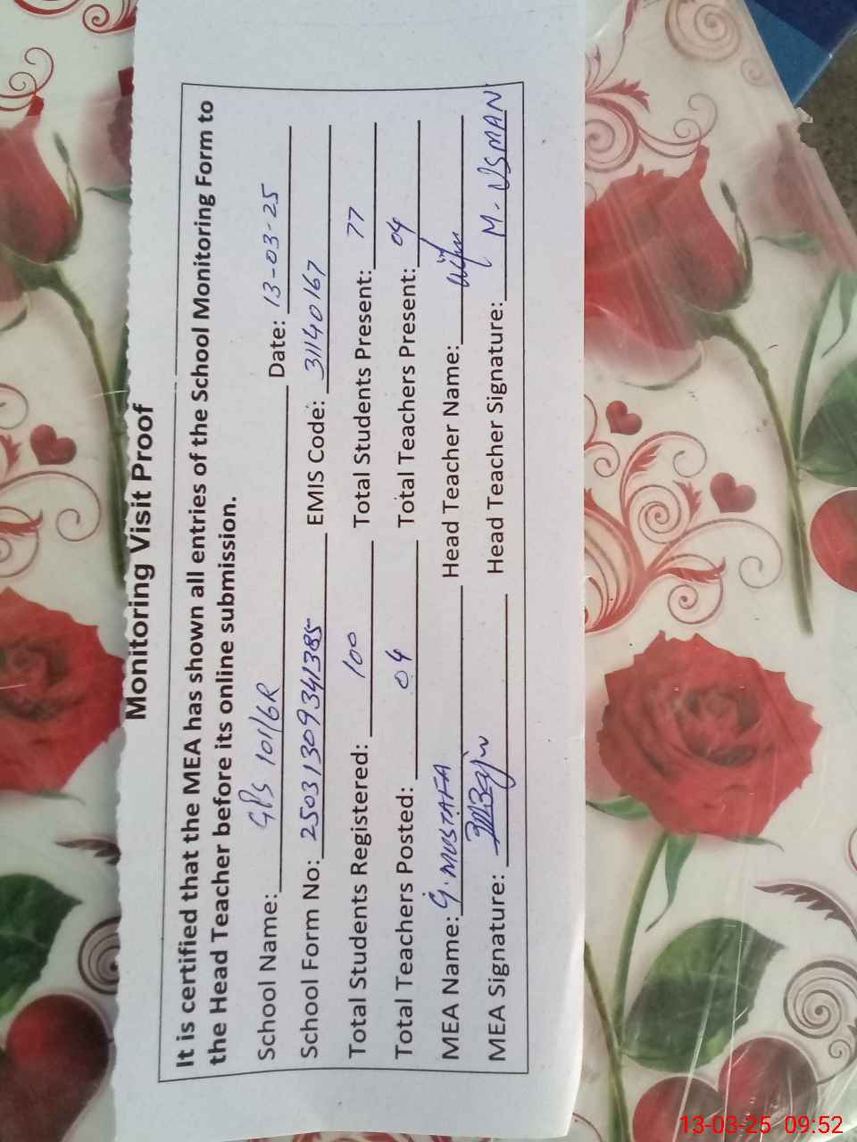 | Attendance Register | Head Teacher | MEA with School | Visit Proof |