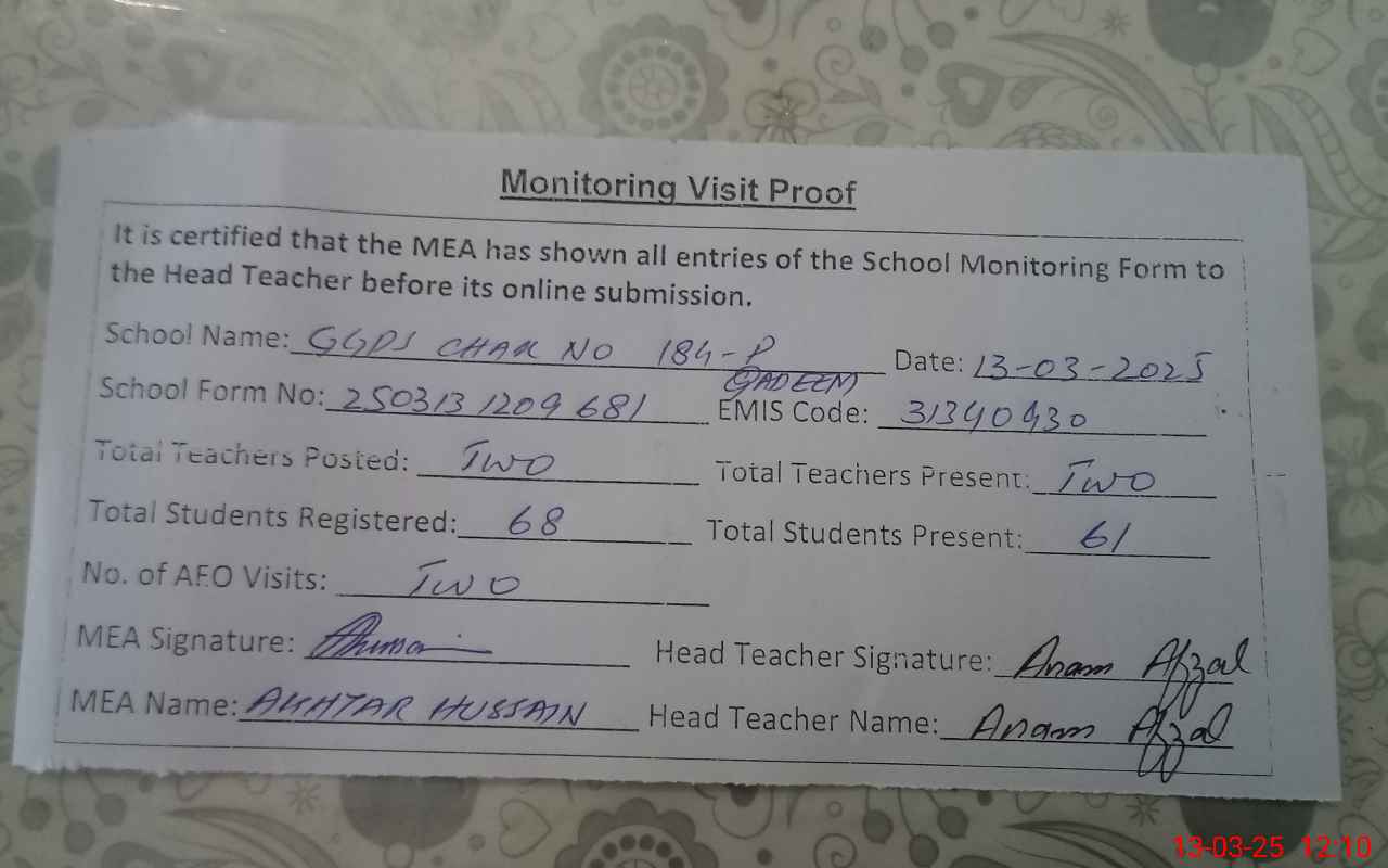 | EMIS Code: 31340430 | Name of School: GGPS 184/P QADEEM | |||
