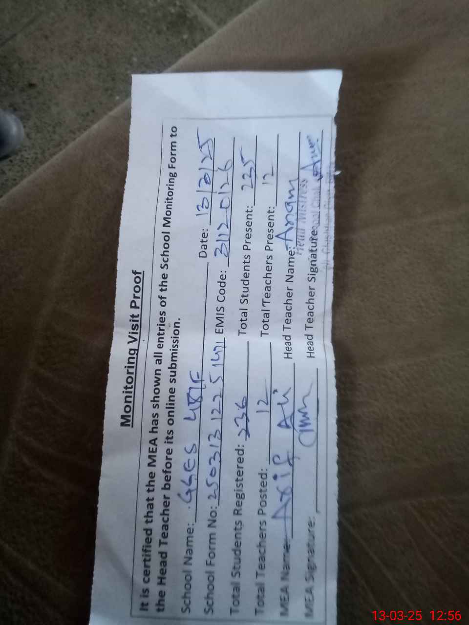| Attendance Register | Head Teacher | MEA with School | Visit Proof |